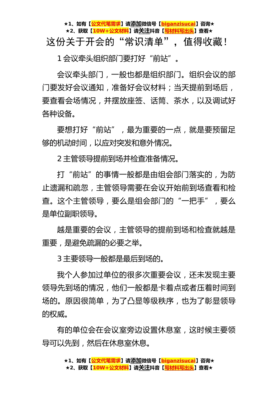 ★1、如有【公文代笔需求】请添加微信号【biganzisucai】咨询★★2、获取【10W+公文材料】请关注抖音【写材料写出头】查看★★1、如有【公文代笔需求】请添加微信号【biganzisucai】咨询★★2、获取【10W+公文材料】请关注抖音【写材料写出头】查看★★1、如有【公文代笔需求】请添加微信号【biganzisucai】咨询★★2、获取【10W+公文材料】请关注抖音【写材料写出头】查看★这份关于开会的“常识清单”,值得收藏!1会议牵头组织部门要打好“前站”。会议牵头部门,一般也都是组织部门。组织会议的部门要发好会议通知,准备好会议材料;当天提前到场后,要查看会场情况,并摆放座签、话筒、茶水,以及调试好各种设备。要想打好“前站”,最为重要的一点,就是要预留足够的机动时间,以应对突发和意外情况。2主管...