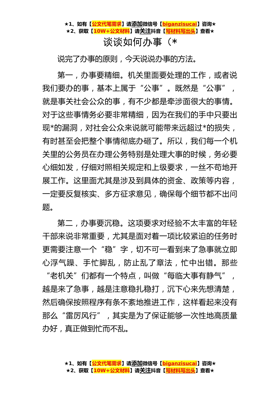 ★1、如有【公文代笔需求】请添加微信号【biganzisucai】咨询★★2、获取【10W+公文材料】请关注抖音【写材料写出头】查看★★1、如有【公文代笔需求】请添加微信号【biganzisucai】咨询★★2、获取【10W+公文材料】请关注抖音【写材料写出头】查看★★1、如有【公文代笔需求】请添加微信号【biganzisucai】咨询★★2、获取【10W+公文材料】请关注抖音【写材料写出头】查看★谈谈如何办事(*说完了办事的原则,今天说说办事的方法。第一,办事要精细。机关里面要处理的工作,或者说我们要办的事,基本上属于“公事”。既然是“公事”,就是事关社会公众的事,有不少都是牵涉面很大的事情。对于这些事情务必要非常精细,因为在我们的手中只要出现*的漏洞,对社会公众来说就可能带来远超过*的损失,有时甚至会把整个...