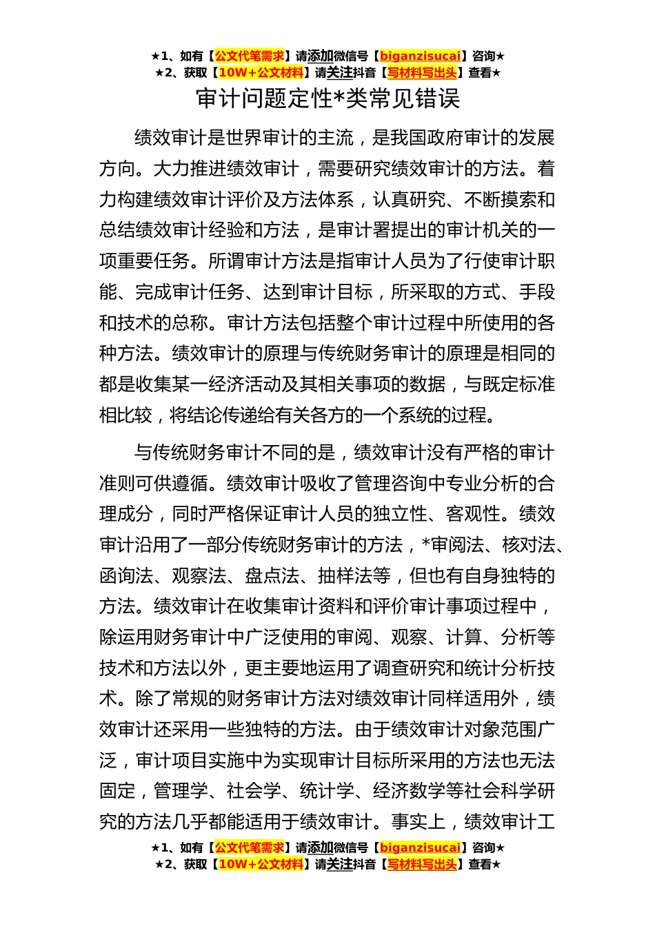 ★1、如有【公文代笔需求】请添加微信号【biganzisucai】咨询★★2、获取【10W+公文材料】请关注抖音【写材料写出头】查看★★1、如有【公文代笔需求】请添加微信号【biganzisucai】咨询★★2、获取【10W+公文材料】请关注抖音【写材料写出头】查看★★1、如有【公文代笔需求】请添加微信号【biganzisucai】咨询★★2、获取【10W+公文材料】请关注抖音【写材料写出头】查看★审计问题定性*类常见错误绩效审计是世界审计的主流,是我国政府审计的发展方向。大力推进绩效审计,需要研究绩效审计的方法。着力构建绩效审计评价及方法体系,认真研究、不断摸索和总结绩效审计经验和方法,是审计署提出的审计机关的一项重要任务。所谓审计方法是指审计人员为了行使审计职能、完成审计任务、达到审计目标,所采取的方式、...