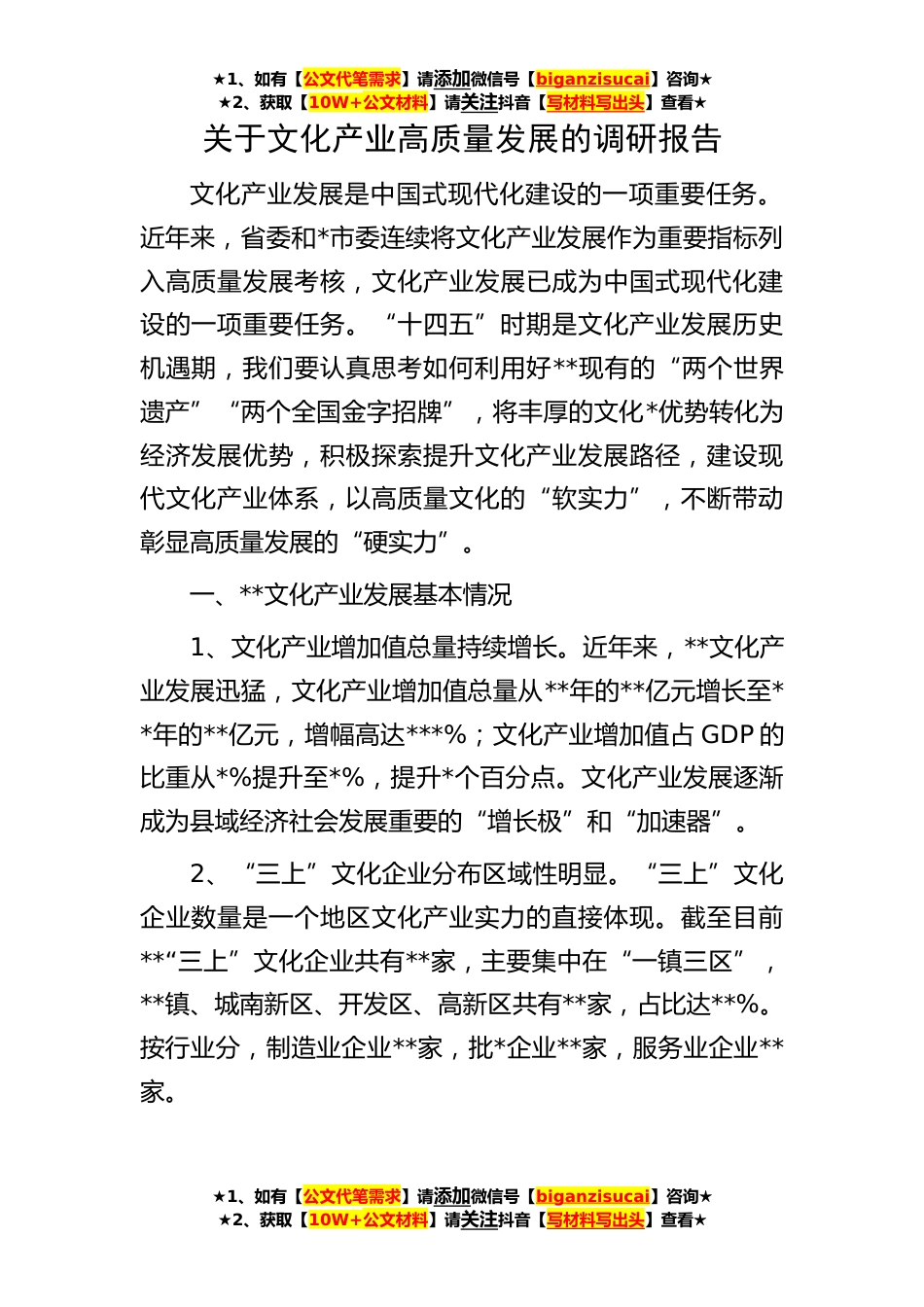 ★1、如有【公文代笔需求】请添加微信号【biganzisucai】咨询★★2、获取【10W+公文材料】请关注抖音【写材料写出头】查看★★1、如有【公文代笔需求】请添加微信号【biganzisucai】咨询★★2、获取【10W+公文材料】请关注抖音【写材料写出头】查看★★1、如有【公文代笔需求】请添加微信号【biganzisucai】咨询★★2、获取【10W+公文材料】请关注抖音【写材料写出头】查看★关于文化产业高质量发展的调研报告文化产业发展是中国式现代化建设的一项重要任务。近年来,省委和*市委连续将文化产业发展作为重要指标列入高质量发展考核,文化产业发展已成为中国式现代化建设的一项重要任务。“十四五”时期是文化产业发展历史机遇期,我们要认真思考如何利用好**现有的“两个世界遗产”“两个全国金字招牌”,将丰厚的...