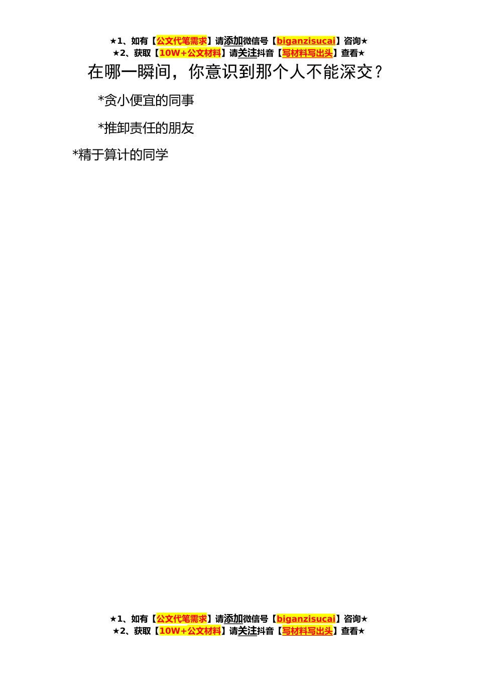 ★1、如有【公文代笔需求】请添加微信号【biganzisucai】咨询★★2、获取【10W+公文材料】请关注抖音【写材料写出头】查看★★1、如有【公文代笔需求】请添加微信号【biganzisucai】咨询★★2、获取【10W+公文材料】请关注抖音【写材料写出头】查看★★1、如有【公文代笔需求】请添加微信号【biganzisucai】咨询★★2、获取【10W+公文材料】请关注抖音【写材料写出头】查看★在哪一瞬间,你意识到那个人不能深交?*贪小便宜的同事*推卸责任的朋友*精于算计的同学★1、如有【公文代笔需求】请添加微信号【biganzisucai】咨询★★2、获取【10W+公文材料】请关注抖音【写材料写出头】查看★★1、如有【公文代笔需求】请添加微信号【biganzisucai】咨询★★2、获取【10W+公文材料】请关注抖音【写材料写出头】查看★马...