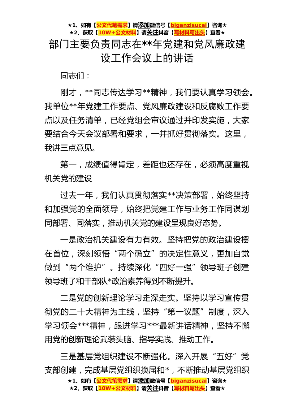 ★1、如有【公文代笔需求】请添加微信号【biganzisucai】咨询★★2、获取【10W+公文材料】请关注抖音【写材料写出头】查看★★1、如有【公文代笔需求】请添加微信号【biganzisucai】咨询★★2、获取【10W+公文材料】请关注抖音【写材料写出头】查看★★1、如有【公文代笔需求】请添加微信号【biganzisucai】咨询★★2、获取【10W+公文材料】请关注抖音【写材料写出头】查看★部门主要负责同志在**年党建和党风廉政建设工作会议上的讲话同志们:刚才,**同志传达学习**精神,我们要认真学习领会。我单位**年党建工作要点、党风廉政建设和反腐败工作要点以及任务清单,已经党组会审议通过并印发实施,大家要结合今天会议部署和要求,一并抓好贯彻落实。这里,我讲三点意见。第一,成绩值得肯定,差距也还存在,必须...