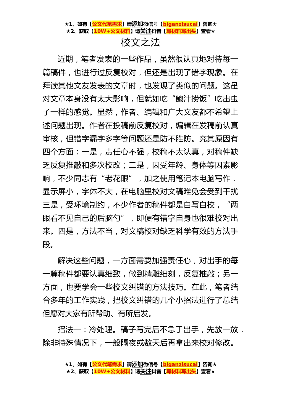 ★1、如有【公文代笔需求】请添加微信号【biganzisucai】咨询★★2、获取【10W+公文材料】请关注抖音【写材料写出头】查看★★1、如有【公文代笔需求】请添加微信号【biganzisucai】咨询★★2、获取【10W+公文材料】请关注抖音【写材料写出头】查看★★1、如有【公文代笔需求】请添加微信号【biganzisucai】咨询★★2、获取【10W+公文材料】请关注抖音【写材料写出头】查看★校文之法近期,笔者发表的一些作品,虽然很认真地对待每一篇稿件,也进行过反复校对,但还是出现了错字现象。在拜读其他文友发表的文章时,也发现了类似的问题。这虽对文章本身没有太大影响,但就如吃“鲍汁捞饭”吃出虫子一样的感觉。显然,作者、编辑和广大文友都不希望上述问题出现。作者在投稿前反复校对,编辑在发稿前认真审核,但错...