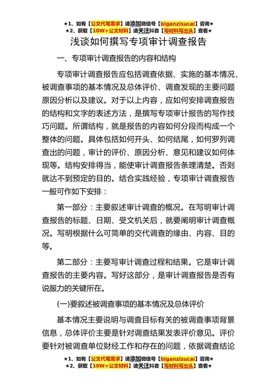 ★1、如有【公文代笔需求】请添加微信号【biganzisucai】咨询★★2、获取【10W+公文材料】请关注抖音【写材料写出头】查看★★1、如有【公文代笔需求】请添加微信号【biganzisucai】咨询★★2、获取【10W+公文材料】请关注抖音【写材料写出头】查看★★1、如有【公文代笔需求】请添加微信号【biganzisucai】咨询★★2、获取【10W+公文材料】请关注抖音【写材料写出头】查看★浅谈如何撰写专项审计调查报告一、专项审计调查报告的内容和结构专项审计调查报告应包括调查依据、实施的基本情况、被调查事项的基本情况及总体评价、调查发现的主要问题原因分析以及建议。对于以上内容,应如何安排调查报告的结构和文字的表述方法,是撰写专项审计报告的写作技巧问题。所谓结构,就是报告的内容如何分段而构成一个整体的...