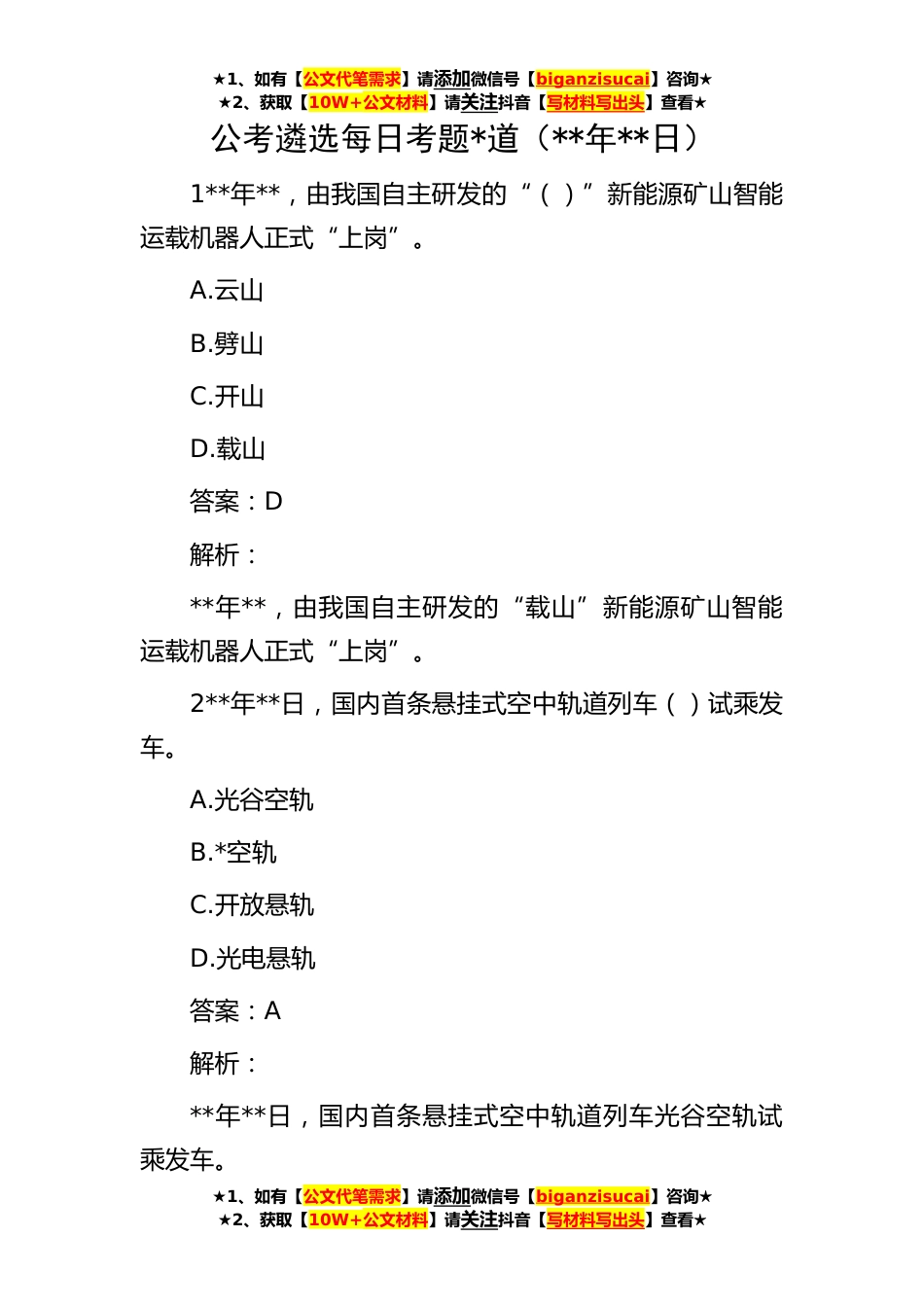 ★1、如有【公文代笔需求】请添加微信号【biganzisucai】咨询★★2、获取【10W+公文材料】请关注抖音【写材料写出头】查看★★1、如有【公文代笔需求】请添加微信号【biganzisucai】咨询★★2、获取【10W+公文材料】请关注抖音【写材料写出头】查看★★1、如有【公文代笔需求】请添加微信号【biganzisucai】咨询★★2、获取【10W+公文材料】请关注抖音【写材料写出头】查看★公考遴选每日考题*道(**年**日)1**年**,由我国自主研发的“()”新能源矿山智能运载机器人正式“上岗”。A.云山B.劈山C.开山D.载山答案:D解析:**年**,由我国自主研发的“载山”新能源矿山智能运载机器人正式“上岗”。2**年**日,国内首条悬挂式空中轨道列车()试乘发车。A.光谷空轨B.*空轨C.开放悬轨D.光电悬轨答案:A解析:**年*...