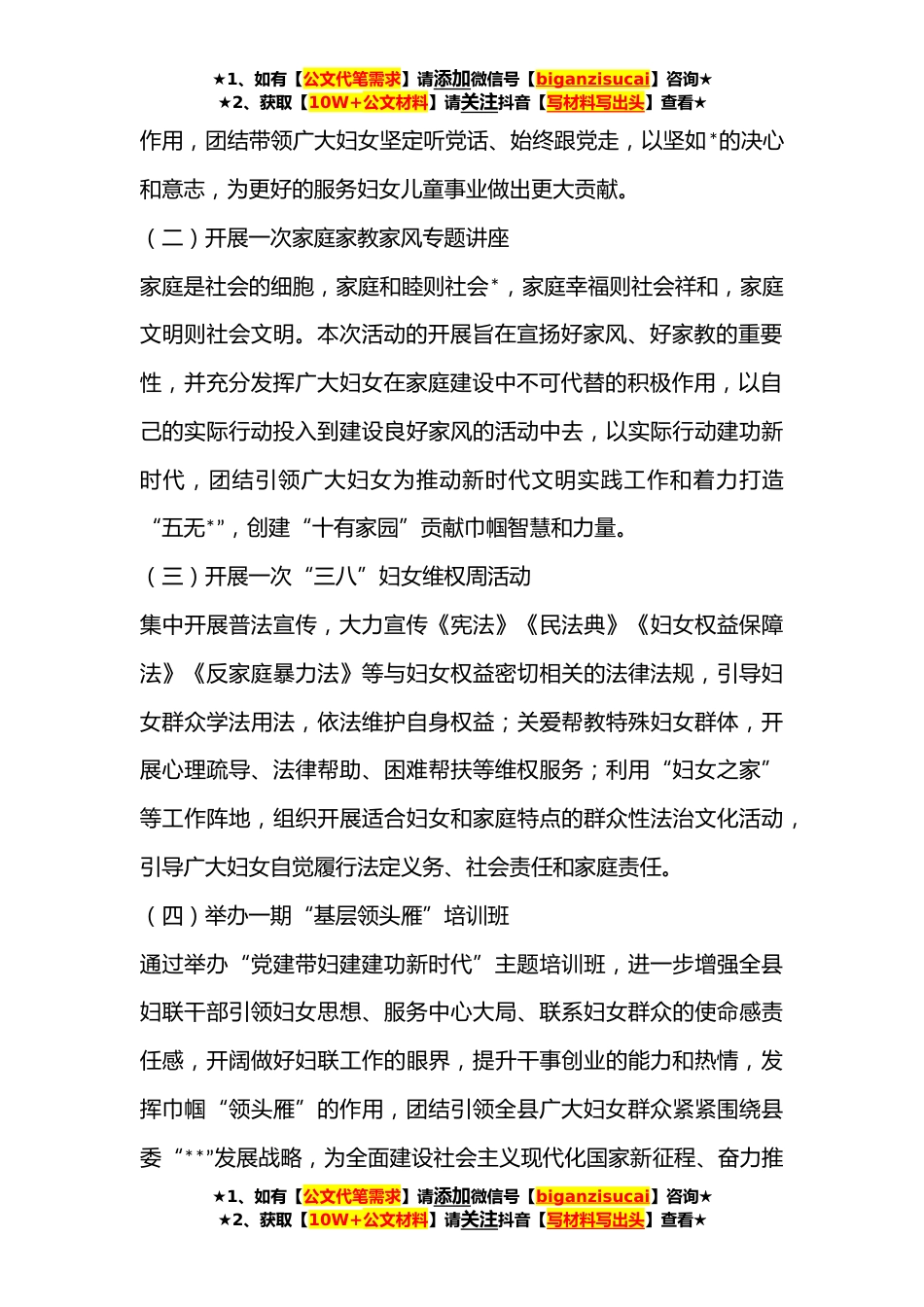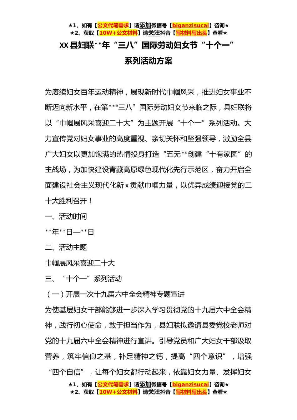 ★1、如有【公文代笔需求】请添加微信号【biganzisucai】咨询★★2、获取【10W+公文材料】请关注抖音【写材料写出头】查看★XX县妇联**年“三八”国际劳动妇女节“十个一”系列活动方案为赓续妇女百年运动精神,展现新时代巾帼风采,推进妇女事业不断迈向新水平,在第**“三八”国际劳动妇女节来临之际,县妇联将以“巾帼展风采喜迎二十大”为主题开展“十个一”系列活动。大力宣传党对妇女事业的高度重视、亲切关怀和坚强领导,激励全县广大妇女以更加饱满的热情投身打造“五无*”创建“十有家园”的主战场,为加快建设青藏高原绿色现代化先行示范区,奋力开启全面建设社会主义现代化新x贡献巾帼力量,以优异成绩迎接党的二十大胜利召开!一、活动时间**年**日—**日二、活动主题巾帼展风采喜迎二十大三、“十个...