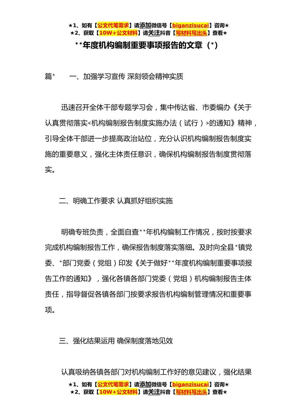 ★1、如有【公文代笔需求】请添加微信号【biganzisucai】咨询★★2、获取【10W+公文材料】请关注抖音【写材料写出头】查看★**年度机构编制重要事项报告的文章(*)篇*一、加强学习宣传深刻领会精神实质迅速召开全体干部专题学习会,集中传达省、市委编办《关于认真贯彻落实<机构编制报告制度实施办法(试行)>的通知》精神,引导全体干部进一步提高政治站位,充分认识机构编制报告制度实施的重要意义,强化主体责任意识,确保机构编制报告制度贯彻落实。二、明确工作要求认真抓好组织实施明确专班负责,全面自查**年机构编制工作情况,按时按要求完成机构编制报告工作,确保报告制度落实落细。及时向全县*镇党委、*部门党委(党组)印发《关于做好**年度机构编制重要事项报告工作的通知》,强化各镇各部门党委(...