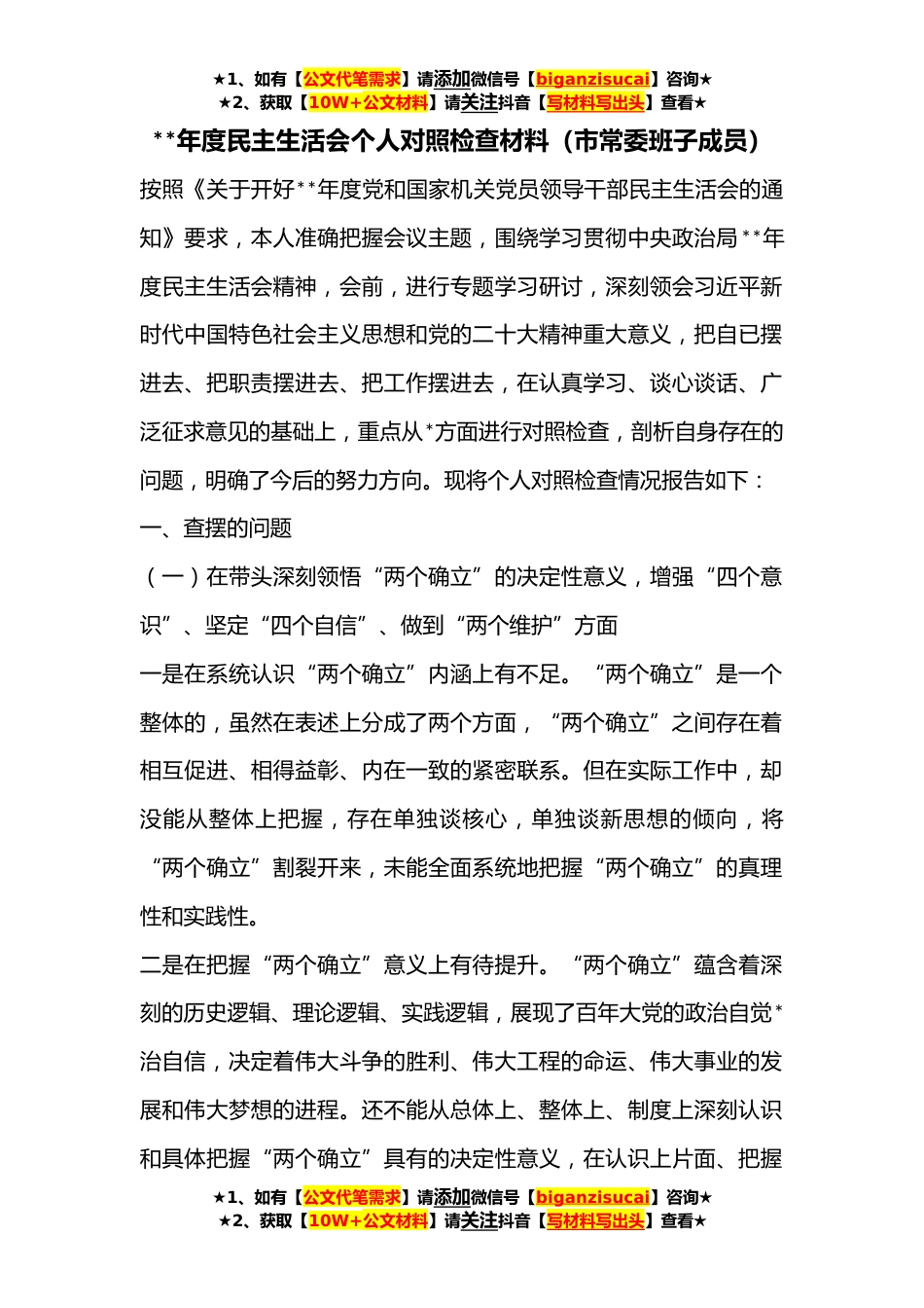 ★1、如有【公文代笔需求】请添加微信号【biganzisucai】咨询★★2、获取【10W+公文材料】请关注抖音【写材料写出头】查看★**年度民主生活会个人对照检查材料(市常委班子成员)按照《关于开好**年度党和国家机关党员领导干部民主生活会的通知》要求,本人准确把握会议主题,围绕学习贯彻中央政治局**年度民主生活会精神,会前,进行专题学习研讨,深刻领会习近平新时代中国特色社会主义思想和党的二十大精神重大意义,把自已摆进去、把职责摆进去、把工作摆进去,在认真学习、谈心谈话、广泛征求意见的基础上,重点从*方面进行对照检查,剖析自身存在的问题,明确了今后的努力方向。现将个人对照检查情况报告如下:一、查摆的问题(一)在带头深刻领悟“两个确立”的决定性意义,增强“四个意识”、坚定“四个自...