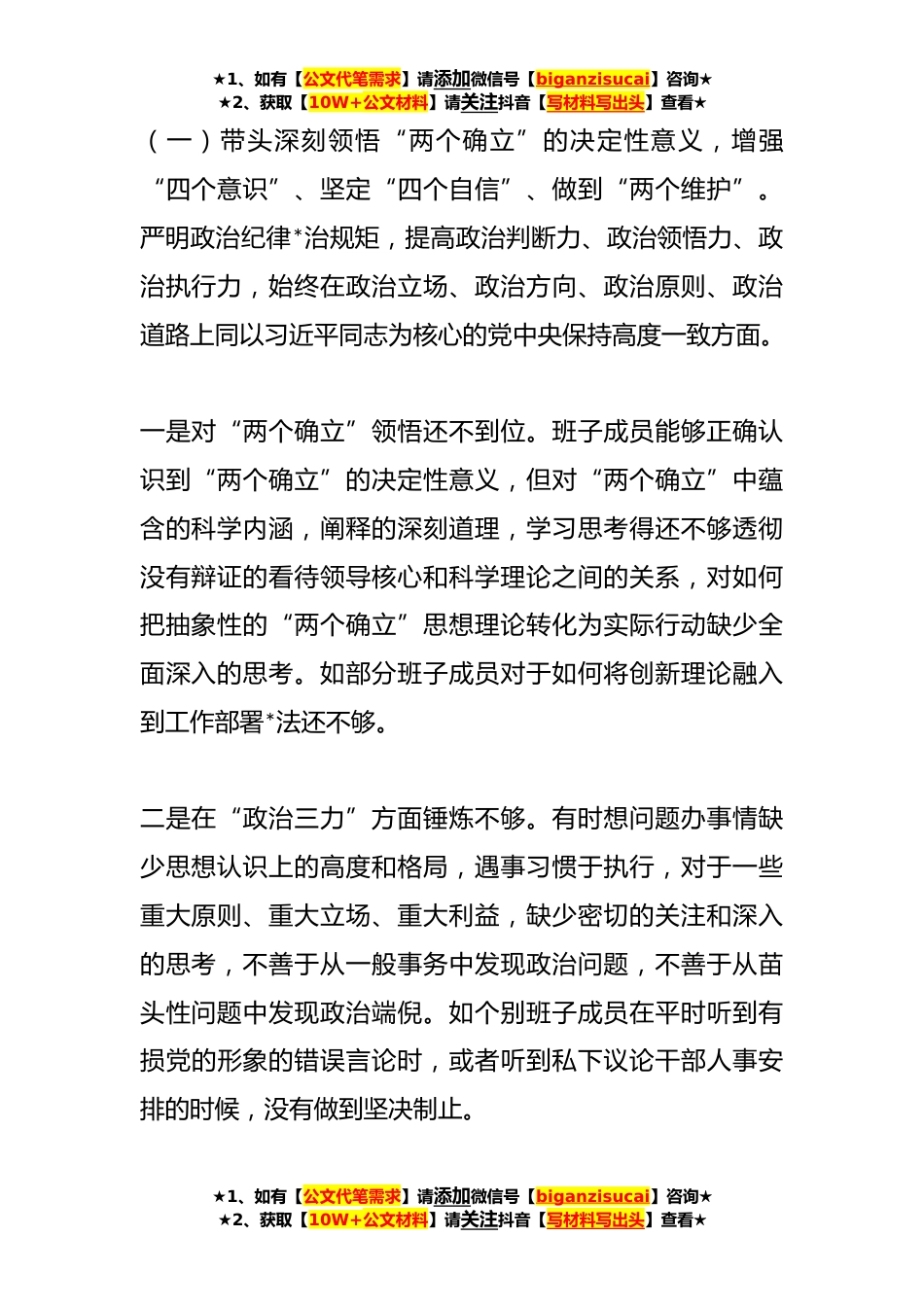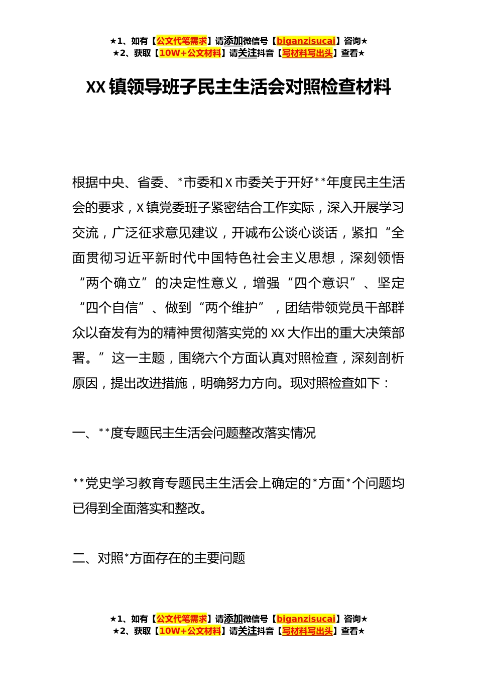 ★1、如有【公文代笔需求】请添加微信号【biganzisucai】咨询★★2、获取【10W+公文材料】请关注抖音【写材料写出头】查看★XX镇领导班子民主生活会对照检查材料根据中央、省委、*市委和X市委关于开好**年度民主生活会的要求,X镇党委班子紧密结合工作实际,深入开展学习交流,广泛征求意见建议,开诚布公谈心谈话,紧扣“全面贯彻习近平新时代中国特色社会主义思想,深刻领悟“两个确立”的决定性意义,增强“四个意识”、坚定“四个自信”、做到“两个维护”,团结带领党员干部群众以奋发有为的精神贯彻落实党的XX大作出的重大决策部署。”这一主题,围绕六个方面认真对照检查,深刻剖析原因,提出改进措施,明确努力方向。现对照检查如下:一、**度专题民主生活会问题整改落实情况**党史学习教育专题民主生活会...