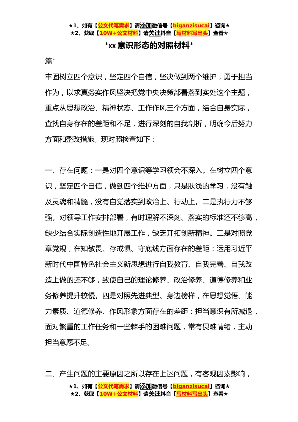 ★1、如有【公文代笔需求】请添加微信号【biganzisucai】咨询★★2、获取【10W+公文材料】请关注抖音【写材料写出头】查看★*xx意识形态的对照材料*篇*牢固树立四个意识,坚定四个自信,坚决做到两个维护,勇于担当作为,以求真务实作风坚决把党中央决策部署落到实处这个主题,重点从思想政治、精神状态、工作作风三个方面,结合自身实际,查找自身存在的差距和不足,进行深刻的自我剖析,明确今后努力方面和整改措施。现对照检查如下:一、存在问题:一是对四个意识等学习领会不深入。在树立四个意识,坚定四个自信,做到四个维护方面,只是肤浅的学习,没有触及灵魂和精髓,没有自觉落实到政治上、行动上。二是执行力不够强。对领导工作安排部署,有时理解不深刻、落实的标准还不够高,缺少结合实际创造性地开展...