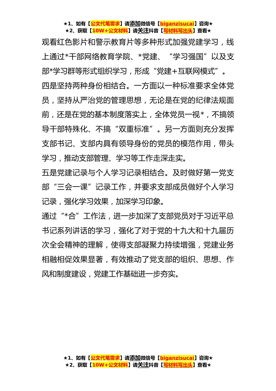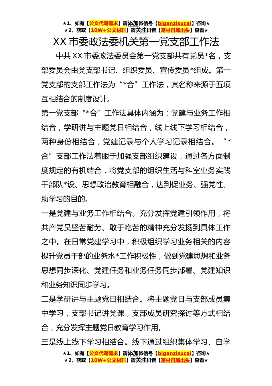 ★1、如有【公文代笔需求】请添加微信号【biganzisucai】咨询★★2、获取【10W+公文材料】请关注抖音【写材料写出头】查看★XX市委政法委机关第一党支部工作法中共XX市委政法委员会第一党支部共有党员*名,支部委员会由党支部书记、组织委员、宣传委员*组成。第一党支部的支部工作法为“*合”工作法,其名称来源于五项互相结合的制度设计。第一党支部“*合”工作法具体内涵为:党建与业务工作相结合,学研讲与主题党日相结合,线上线下学习相结合,两种身份相结合,党建记录与个人学习记录相结合。“*合”支部工作法着眼于加强支部组织建设,通过各方面制度规定的有机结合,将党支部的组织生活与科室业务实践干部队*设、思想政治教育相融合,达到促业务、强党性、助学习的目的。一是党建与业务工作相结合。充分发...