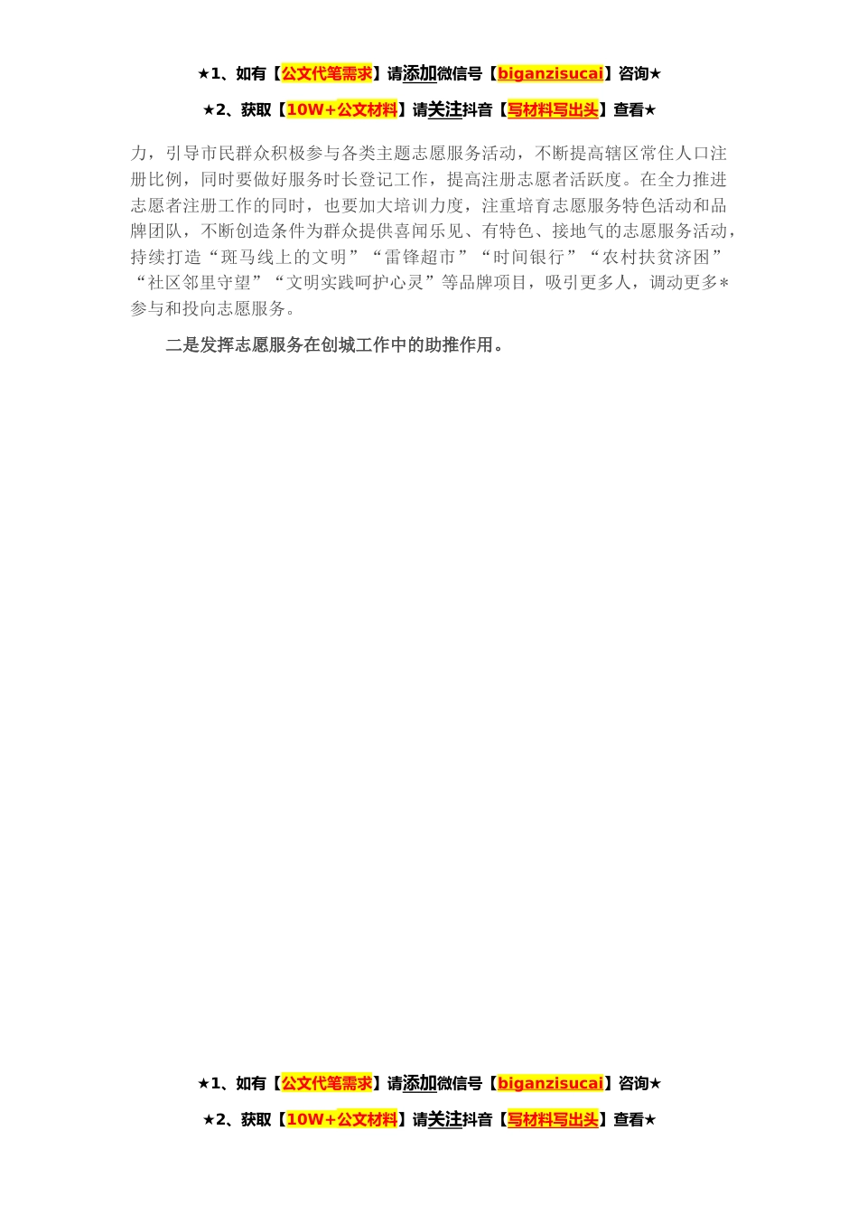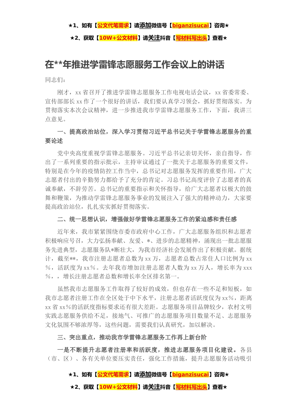★1、如有【公文代笔需求】请添加微信号【biganzisucai】咨询★★2、获取【10W+公文材料】请关注抖音【写材料写出头】查看★在**年推进学雷锋志愿服务工作会议上的讲话同志们:刚才,xx省召开了推进学雷锋志愿服务工作电视电话会议,xx省委常委、宣传部部长xx作了一个很好的讲话,我们要认真学习领会,抓好贯彻落实。为贯彻落实本次会议精神,进一步推进我市学雷锋志愿服务工作,下面,我讲三点意见。一、提高政治站位,深入学习贯彻习近平总书记关于学雷锋志愿服务的重要论述党中央高度重视学雷锋志愿服务。习近平总书记亲切关怀,亲自指导,作出了一系列重要的指示批示,主持审议通过了一批关于志愿服务的重要文件,特别是在今年的疫情防控工作当中,总书记对志愿服务发挥的重要作用,广大志愿者付出的辛勤努力...