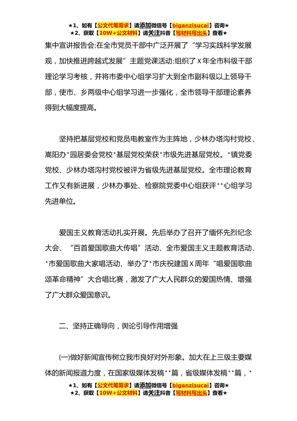 ★1、如有【公文代笔需求】请添加微信号【biganzisucai】咨询★★2、获取【10W+公文材料】请关注抖音【写材料写出头】查看★市委宣传部工作计划范文(*篇)篇*X年,面对全球经济危机带来的不利影响,*市委宣传部在市委、市政府和*市委宣传部的坚强领导下,坚持以邓小平理论和“三个代表”重要思想为指导,深入贯彻党的xx届三中、四中全会精神,全面落实科学发展观,按照高举旗帜、围绕大局、服务人民、改革创新的总要求,牢牢把握统一思想、鼓舞干劲、凝心聚力、促进发展的宣传理念,紧紧围绕市委、市政府的中心工作,唱响主旋律、打好主动仗,各项工作扎实有效推进,为树立信心、化解危机、凝聚全市人民克难攻坚,实现*经济社会跨越式发展提供了强大的思想文化保证和舆论支持。一、坚持*思想,理论武装力度加大今...