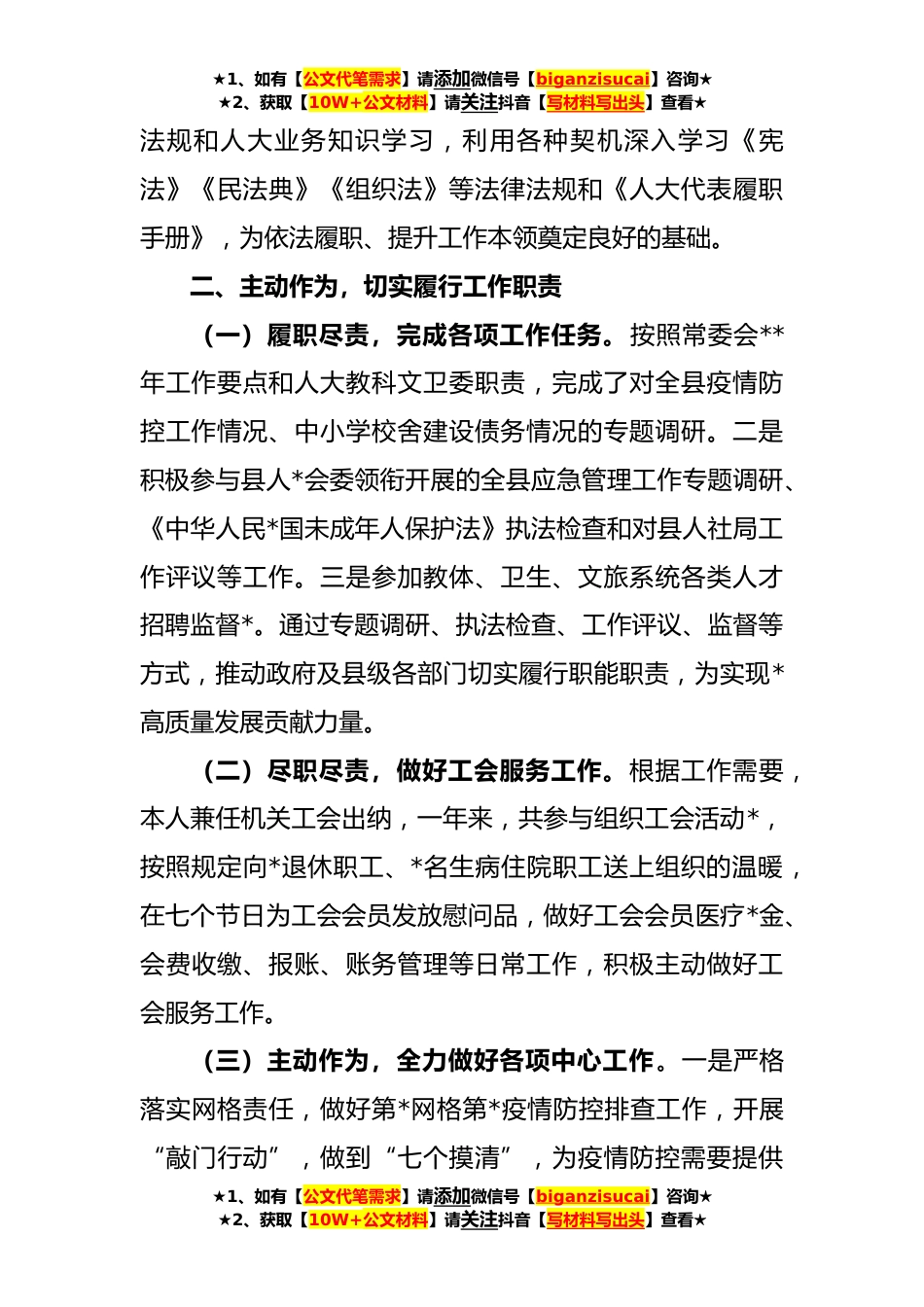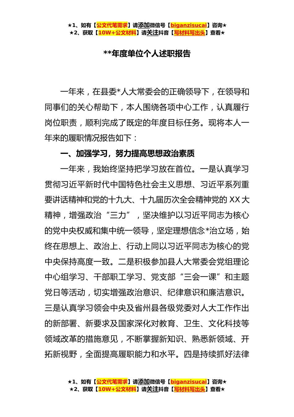 ★1、如有【公文代笔需求】请添加微信号【biganzisucai】咨询★★2、获取【10W+公文材料】请关注抖音【写材料写出头】查看★**年度单位个人述职报告一年来,在县委*人大常委会的正确领导下,在领导和同事们的关心帮助下,本人围绕各项中心工作,认真履行岗位职责,顺利完成了既定的年度目标任务。现将本人一年来的履职情况报告如下:一、加强学习,努力提高思想政治素质一年来,我始终坚持把学习放在首位。一是认真学习贯彻习近平新时代中国特色社会主义思想、习近平系列重要讲话精神和党的十九大、十九届历次全会精神党的XX大精神,增强政治“三力”,坚决维护以习近平同志为核心的党中央权威和集中统一领导,坚定理想信念*治立场,始终在思想上、政治上、行动上同以习近平同志为核心的党中央保持高度一致。二是...