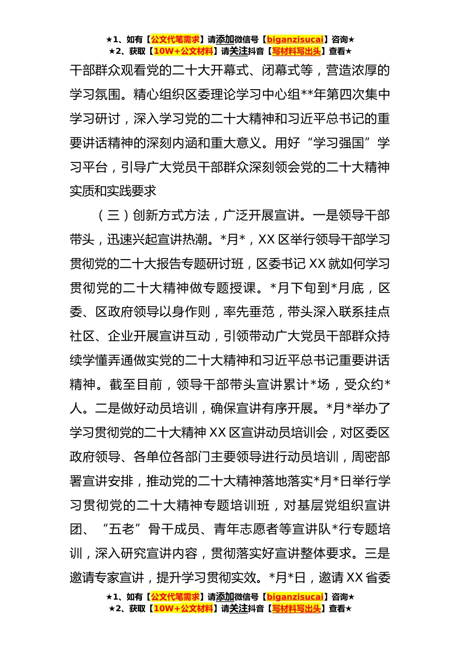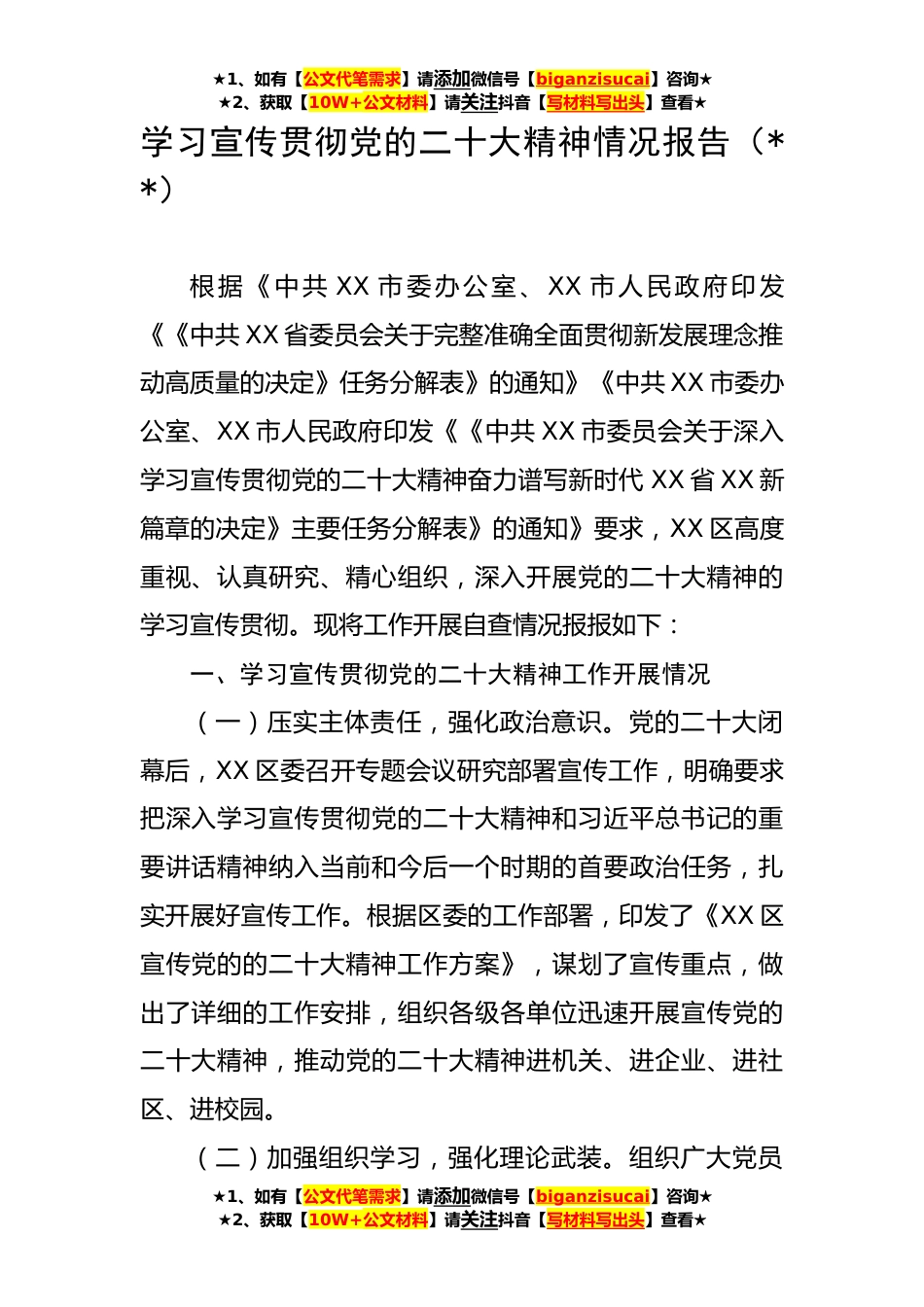 ★1、如有【公文代笔需求】请添加微信号【biganzisucai】咨询★★2、获取【10W+公文材料】请关注抖音【写材料写出头】查看★学习宣传贯彻党的二十大精神情况报告(**)根据《中共XX市委办公室、XX市人民政府印发《《中共XX省委员会关于完整准确全面贯彻新发展理念推动高质量的决定》任务分解表》的通知》《中共XX市委办公室、XX市人民政府印发《《中共XX市委员会关于深入学习宣传贯彻党的二十大精神奋力谱写新时代XX省XX新篇章的决定》主要任务分解表》的通知》要求,XX区高度重视、认真研究、精心组织,深入开展党的二十大精神的学习宣传贯彻。现将工作开展自查情况报报如下:一、学习宣传贯彻党的二十大精神工作开展情况(一)压实主体责任,强化政治意识。党的二十大闭幕后,XX区委召开专题会议研究部署宣传工...