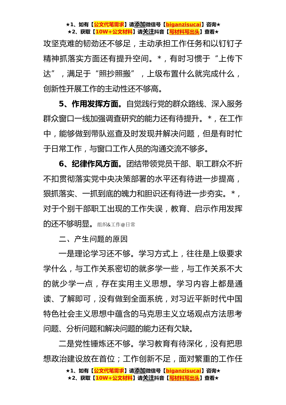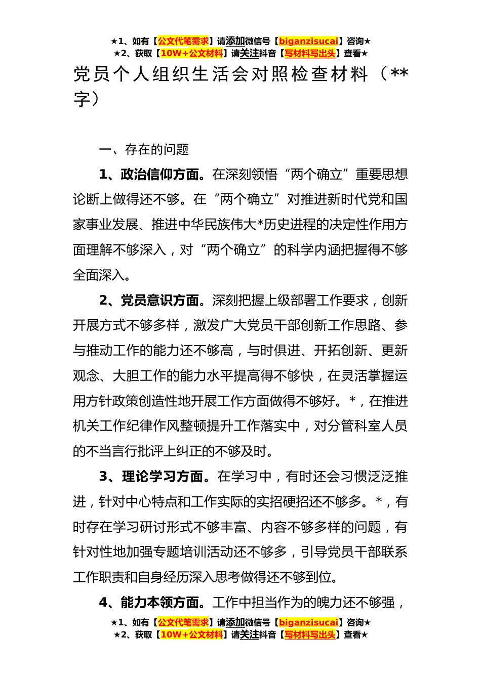 ★1、如有【公文代笔需求】请添加微信号【biganzisucai】咨询★★2、获取【10W+公文材料】请关注抖音【写材料写出头】查看★党员个人组织生活会对照检查材料(**字)一、存在的问题1、政治信仰方面。在深刻领悟“两个确立”重要思想论断上做得还不够。在“两个确立”对推进新时代党和国家事业发展、推进中华民族伟大*历史进程的决定性作用方面理解不够深入,对“两个确立”的科学内涵把握得不够全面深入。2、党员意识方面。深刻把握上级部署工作要求,创新开展方式不够多样,激发广大党员干部创新工作思路、参与推动工作的能力还不够高,与时俱进、开拓创新、更新观念、大胆工作的能力水平提高得不够快,在灵活掌握运用方针政策创造性地开展工作方面做得不够好。*,在推进机关工作纪律作风整顿提升工作落实中,对...