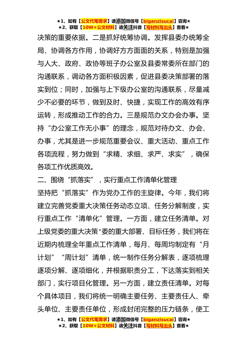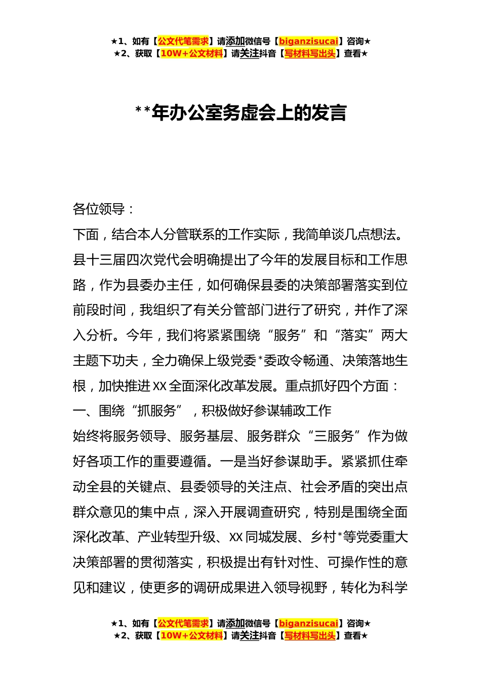 ★1、如有【公文代笔需求】请添加微信号【biganzisucai】咨询★★2、获取【10W+公文材料】请关注抖音【写材料写出头】查看★**年办公室务虚会上的发言各位领导:下面,结合本人分管联系的工作实际,我简单谈几点想法。县十三届四次党代会明确提出了今年的发展目标和工作思路,作为县委办主任,如何确保县委的决策部署落实到位前段时间,我组织了有关分管部门进行了研究,并作了深入分析。今年,我们将紧紧围绕“服务”和“落实”两大主题下功夫,全力确保上级党委*委政令畅通、决策落地生根,加快推进XX全面深化改革发展。重点抓好四个方面:一、围绕“抓服务”,积极做好参谋辅政工作始终将服务领导、服务基层、服务群众“三服务”作为做好各项工作的重要遵循。一是当好参谋助手。紧紧抓住牵动全县的关键点、县委...