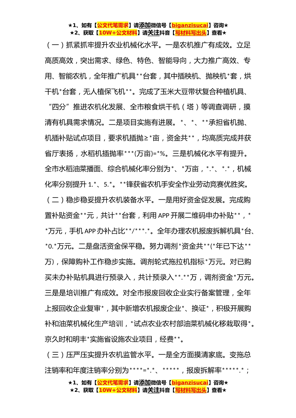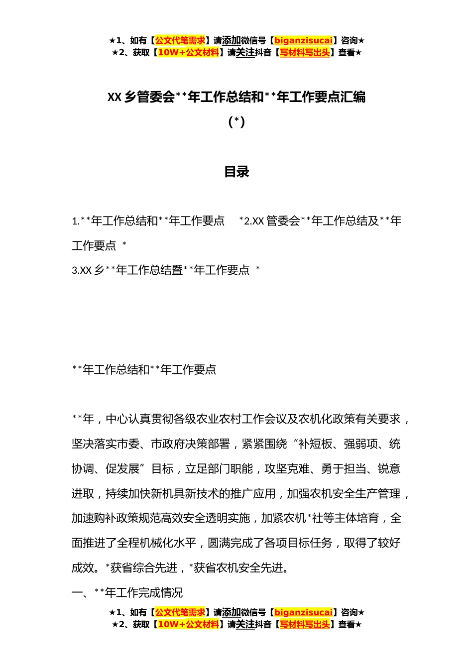 ★1、如有【公文代笔需求】请添加微信号【biganzisucai】咨询★★2、获取【10W+公文材料】请关注抖音【写材料写出头】查看★XX乡管委会**年工作总结和**年工作要点汇编(*)目录1.**年工作总结和**年工作要点*2.XX管委会**年工作总结及**年工作要点*3.XX乡**年工作总结暨**年工作要点***年工作总结和**年工作要点**年,中心认真贯彻各级农业农村工作会议及农机化政策有关要求,坚决落实市委、市政府决策部署,紧紧围绕“补短板、强弱项、统协调、促发展”目标,立足部门职能,攻坚克难、勇于担当、锐意进取,持续加快新机具新技术的推广应用,加强农机安全生产管理,加速购补政策规范高效安全透明实施,加紧农机*社等主体培育,全面推进了全程机械化水平,圆满完成了各项目标任务,取得了较好成效。*获省综合先进...