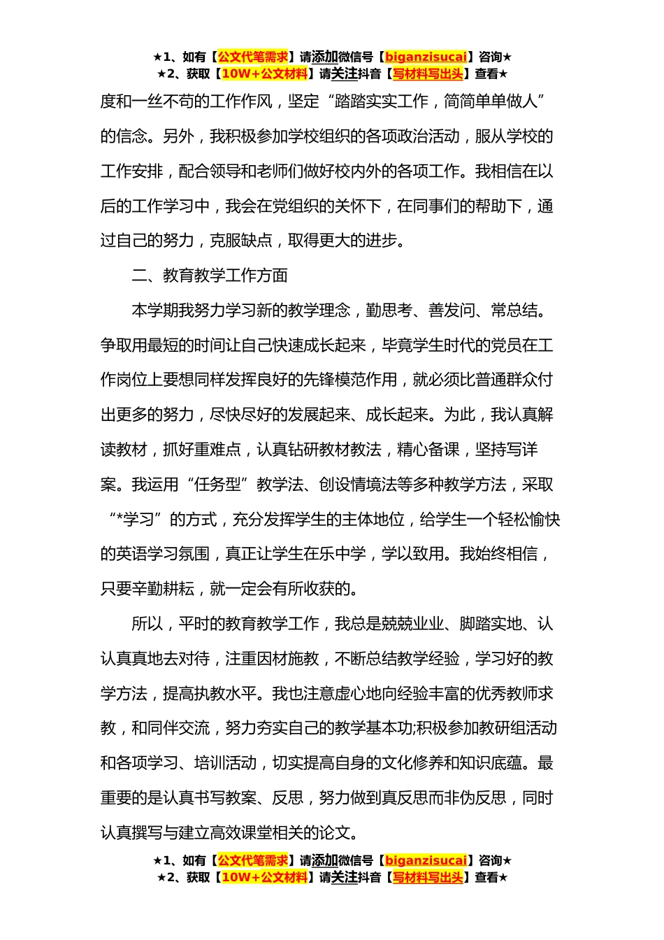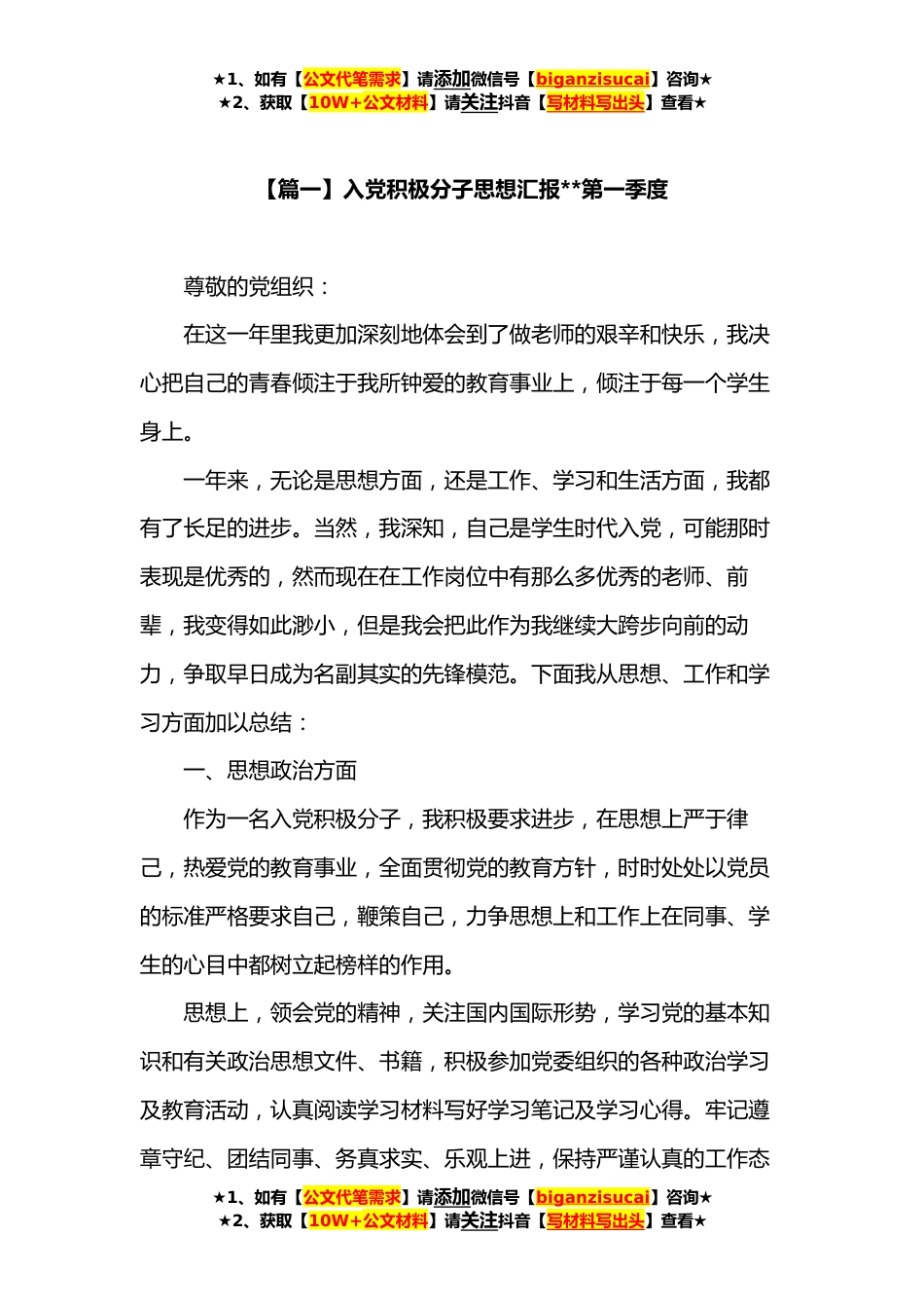 ★1、如有【公文代笔需求】请添加微信号【biganzisucai】咨询★★2、获取【10W+公文材料】请关注抖音【写材料写出头】查看★【篇一】入党积极分子思想汇报**第一季度尊敬的党组织:在这一年里我更加深刻地体会到了做老师的艰辛和快乐,我决心把自己的青春倾注于我所钟爱的教育事业上,倾注于每一个学生身上。一年来,无论是思想方面,还是工作、学习和生活方面,我都有了长足的进步。当然,我深知,自己是学生时代入党,可能那时表现是优秀的,然而现在在工作岗位中有那么多优秀的老师、前辈,我变得如此渺小,但是我会把此作为我继续大跨步向前的动力,争取早日成为名副其实的先锋模范。下面我从思想、工作和学习方面加以总结:一、思想政治方面作为一名入党积极分子,我积极要求进步,在思想上严于律己,热爱党...