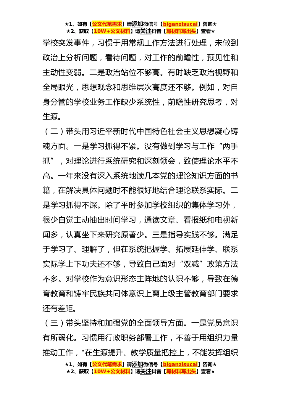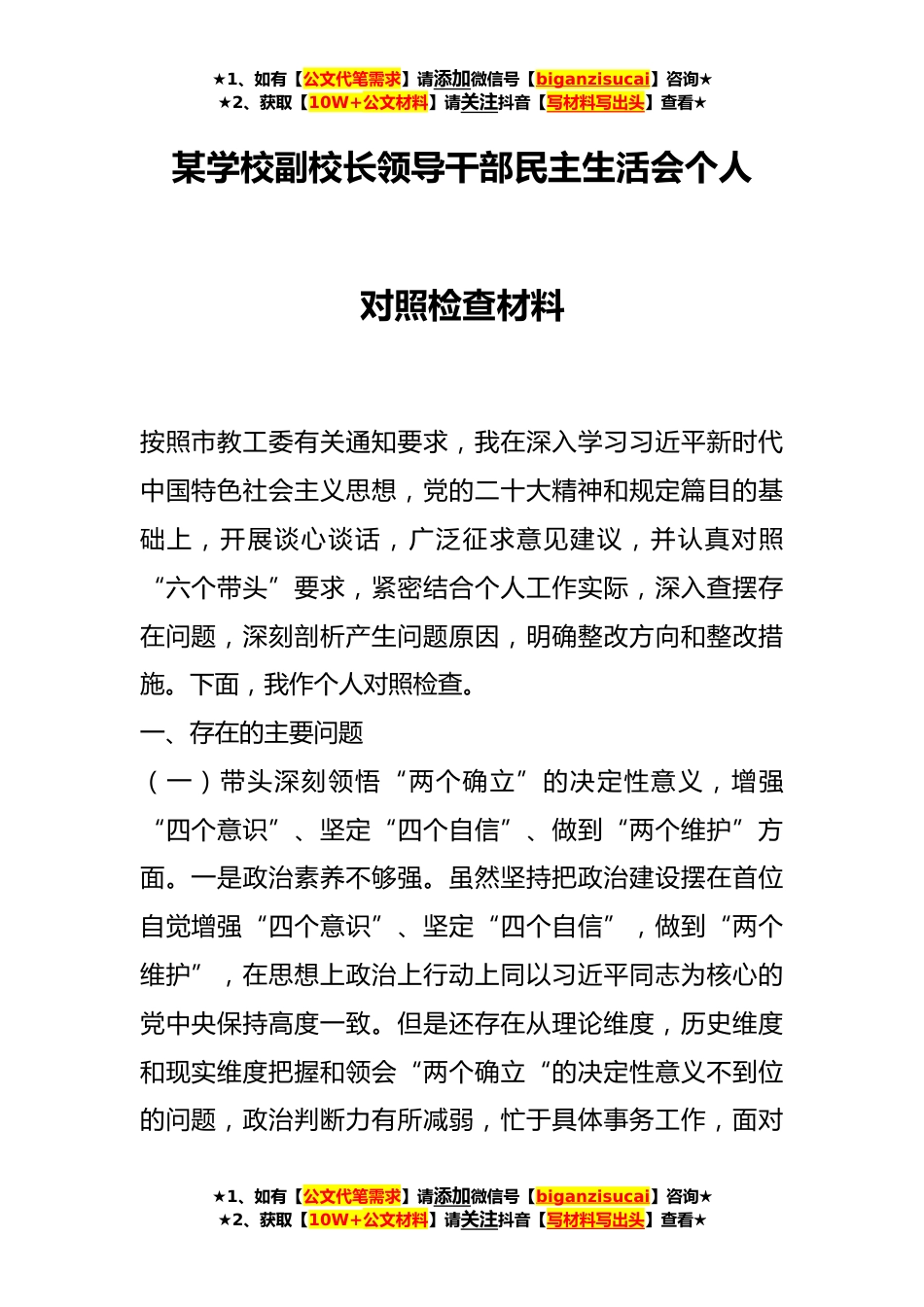 ★1、如有【公文代笔需求】请添加微信号【biganzisucai】咨询★★2、获取【10W+公文材料】请关注抖音【写材料写出头】查看★某学校副校长领导干部民主生活会个人对照检查材料按照市教工委有关通知要求,我在深入学习习近平新时代中国特色社会主义思想,党的二十大精神和规定篇目的基础上,开展谈心谈话,广泛征求意见建议,并认真对照“六个带头”要求,紧密结合个人工作实际,深入查摆存在问题,深刻剖析产生问题原因,明确整改方向和整改措施。下面,我作个人对照检查。一、存在的主要问题(一)带头深刻领悟“两个确立”的决定性意义,增强“四个意识”、坚定“四个自信”、做到“两个维护”方面。一是政治素养不够强。虽然坚持把政治建设摆在首位自觉增强“四个意识”、坚定“四个自信”,做到“两个维护”,...