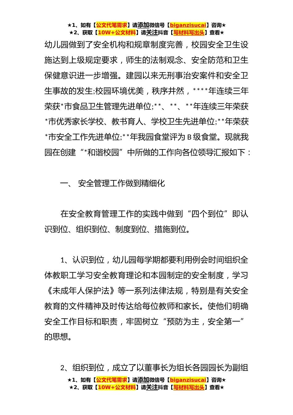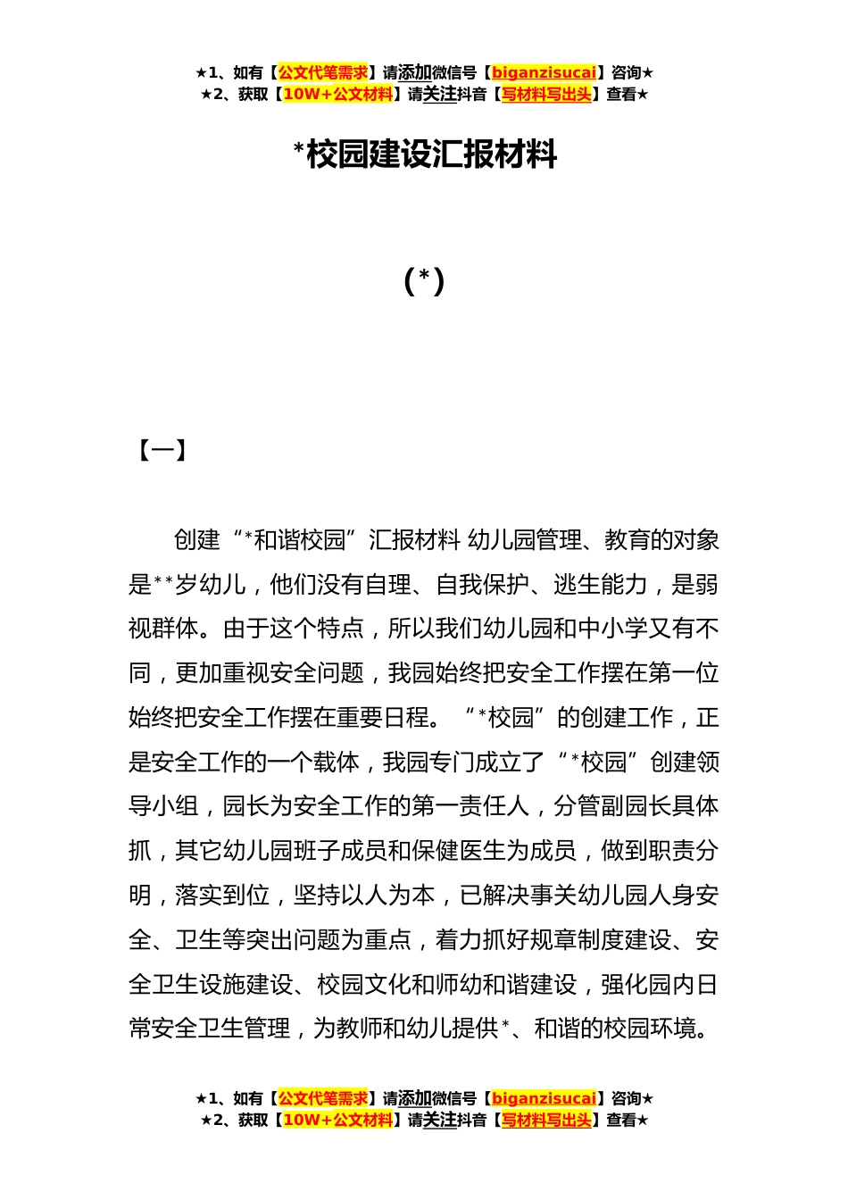 ★1、如有【公文代笔需求】请添加微信号【biganzisucai】咨询★★2、获取【10W+公文材料】请关注抖音【写材料写出头】查看★*校园建设汇报材料(*)【一】创建“*和谐校园”汇报材料幼儿园管理、教育的对象是**岁幼儿,他们没有自理、自我保护、逃生能力,是弱视群体。由于这个特点,所以我们幼儿园和中小学又有不同,更加重视安全问题,我园始终把安全工作摆在第一位始终把安全工作摆在重要日程。“*校园”的创建工作,正是安全工作的一个载体,我园专门成立了“*校园”创建领导小组,园长为安全工作的第一责任人,分管副园长具体抓,其它幼儿园班子成员和保健医生为成员,做到职责分明,落实到位,坚持以人为本,已解决事关幼儿园人身安全、卫生等突出问题为重点,着力抓好规章制度建设、安全卫生设施建设、校园...