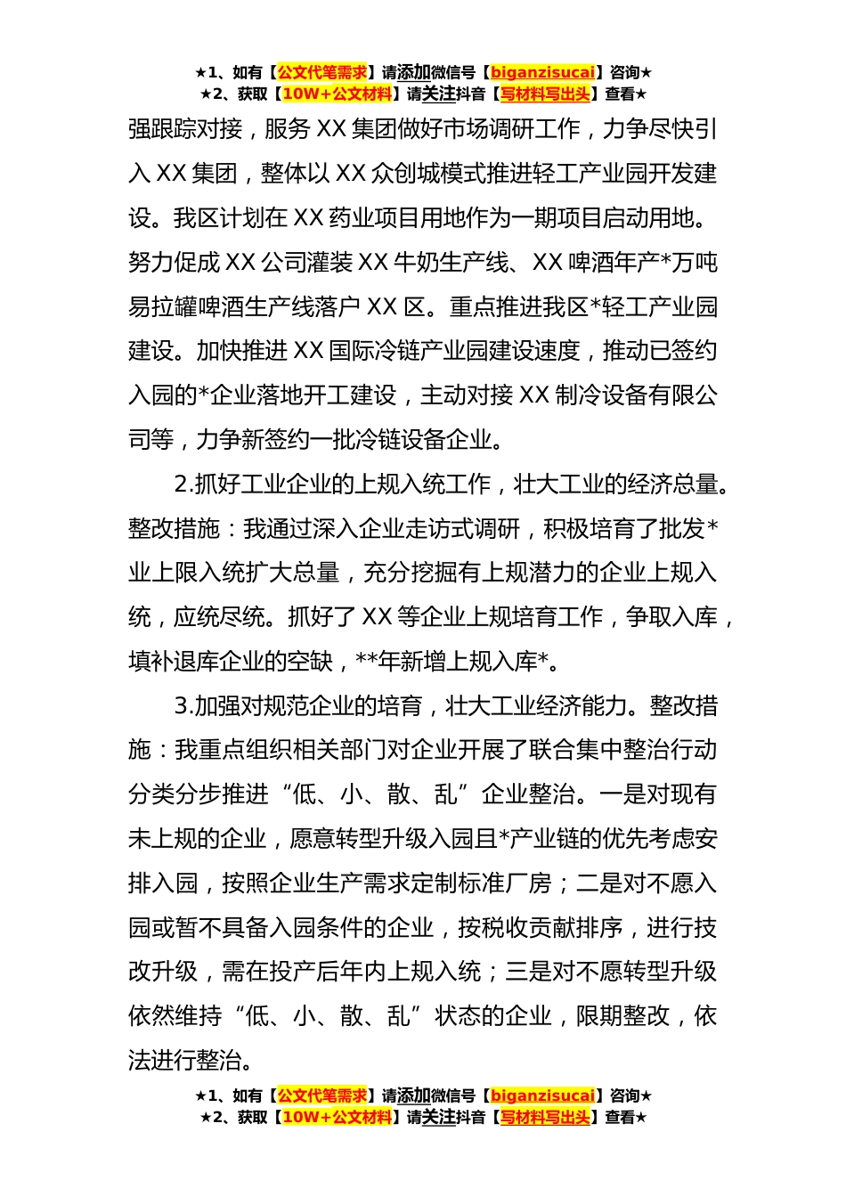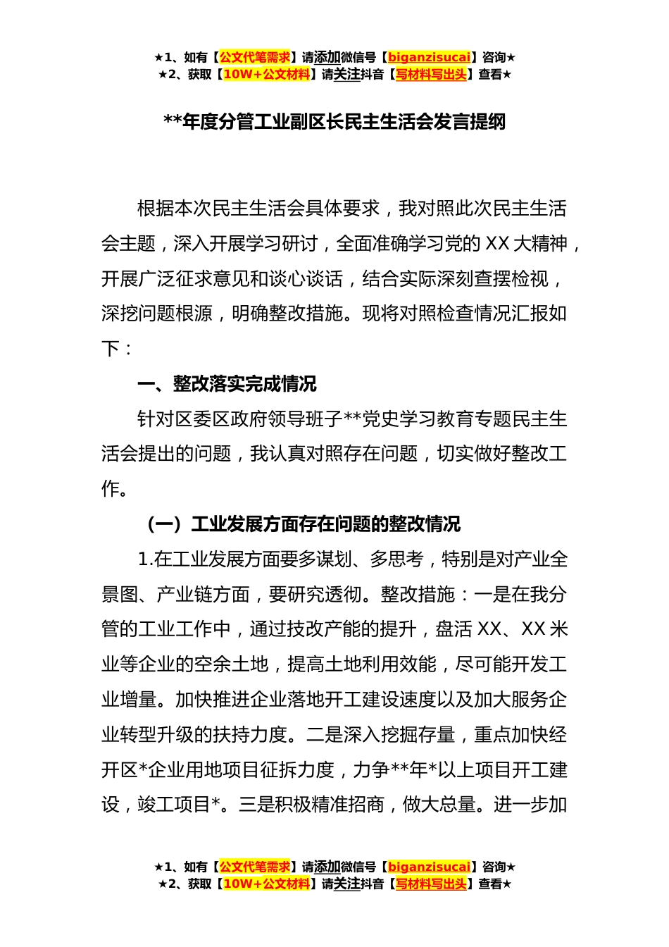 ★1、如有【公文代笔需求】请添加微信号【biganzisucai】咨询★★2、获取【10W+公文材料】请关注抖音【写材料写出头】查看★**年度分管工业副区长民主生活会发言提纲根据本次民主生活会具体要求,我对照此次民主生活会主题,深入开展学习研讨,全面准确学习党的XX大精神,开展广泛征求意见和谈心谈话,结合实际深刻查摆检视,深挖问题根源,明确整改措施。现将对照检查情况汇报如下:一、整改落实完成情况针对区委区政府领导班子**党史学习教育专题民主生活会提出的问题,我认真对照存在问题,切实做好整改工作。(一)工业发展方面存在问题的整改情况1.在工业发展方面要多谋划、多思考,特别是对产业全景图、产业链方面,要研究透彻。整改措施:一是在我分管的工业工作中,通过技改产能的提升,盘活XX、XX米业等...