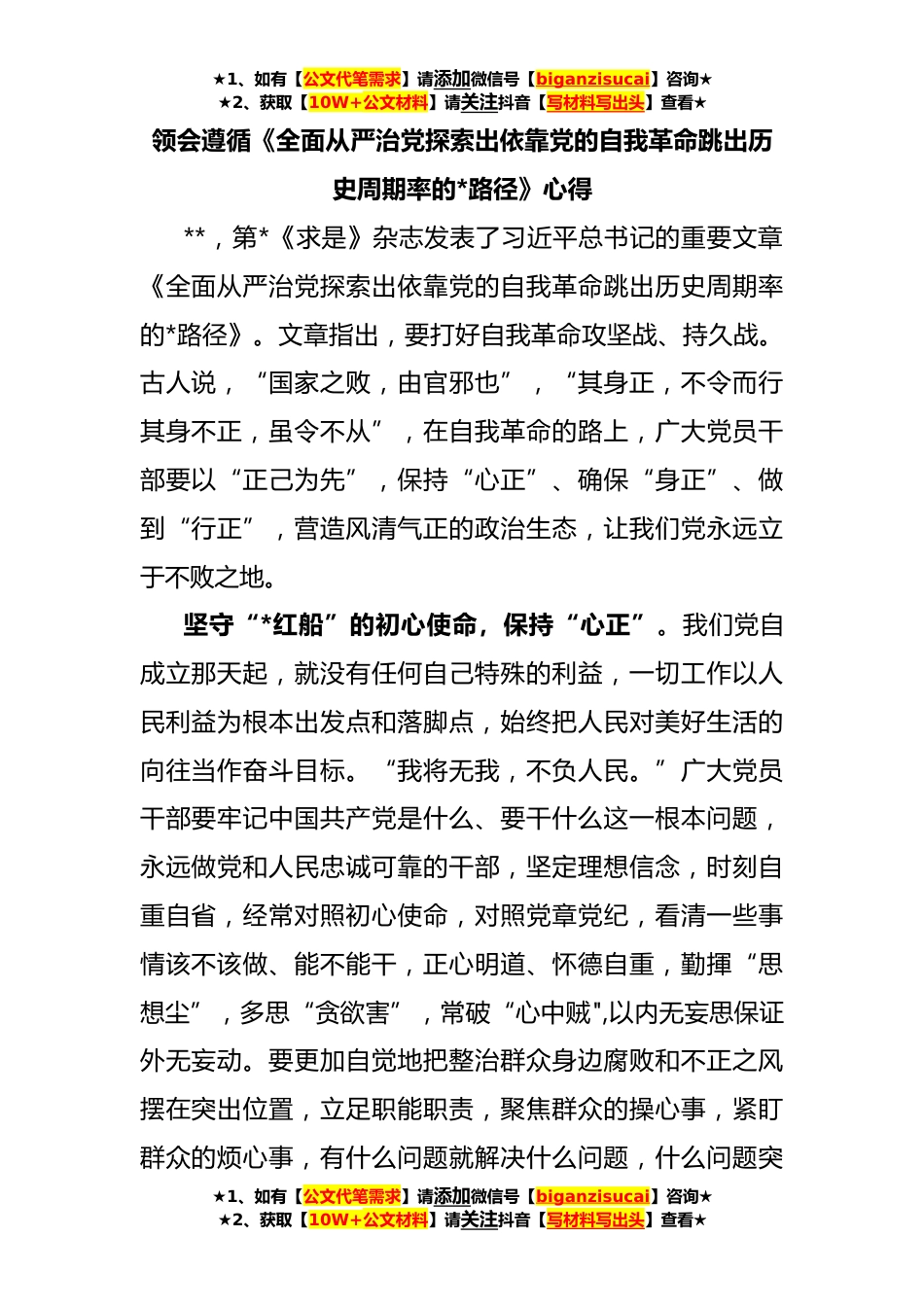 领会遵循《全面从严治党探索出依靠党的自我革命跳出历史周期率的成功路径》心得