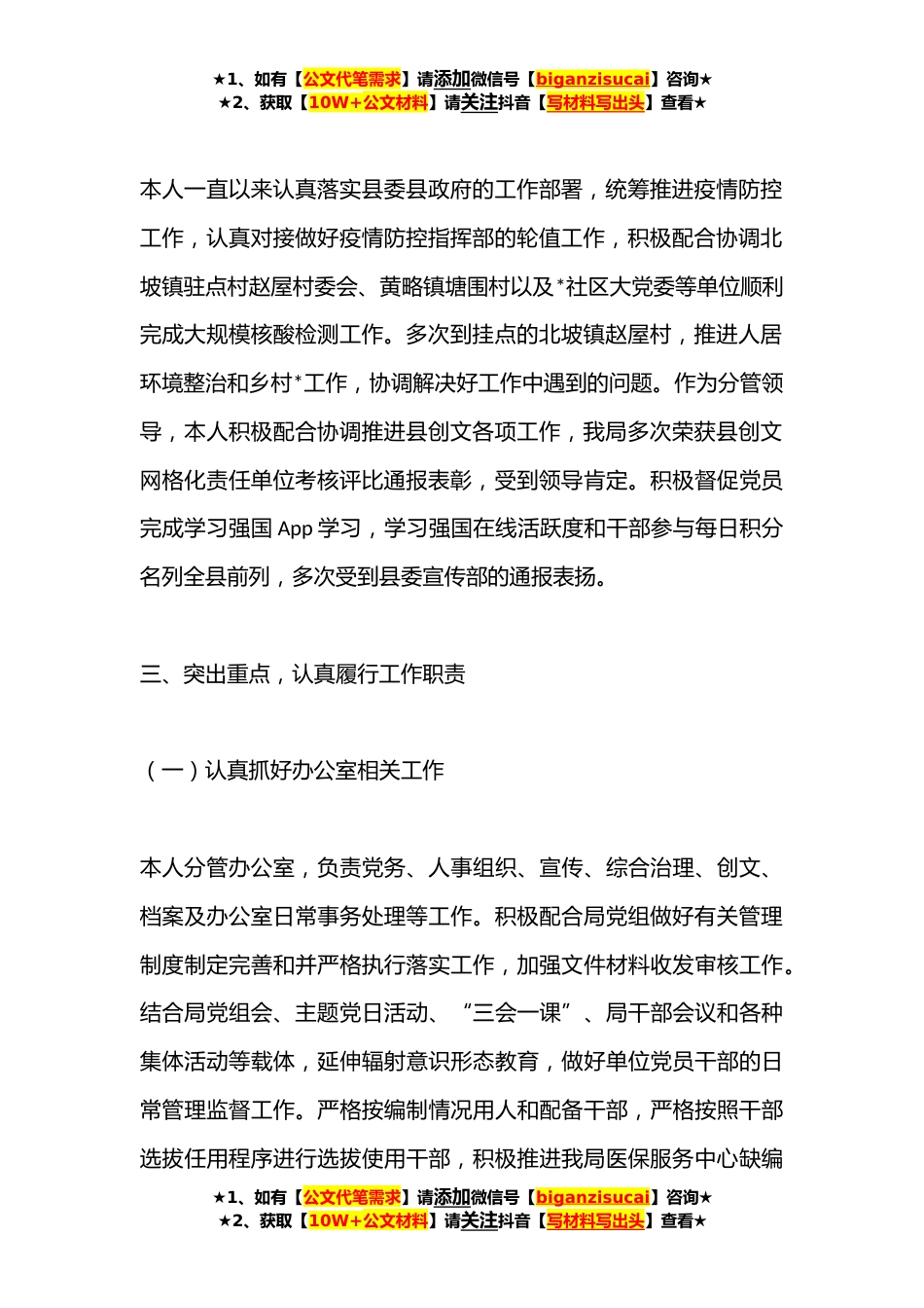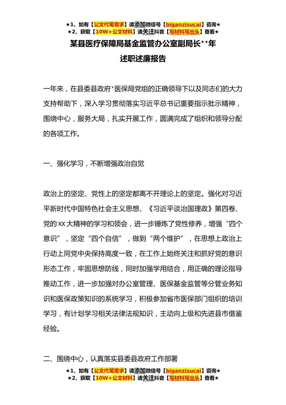 ★1、如有【公文代笔需求】请添加微信号【biganzisucai】咨询★★2、获取【10W+公文材料】请关注抖音【写材料写出头】查看★某县医疗保障局基金监管办公室副局长**年述职述廉报告一年来,在县委县政府*医保局党组的正确领导下以及同志们的大力支持帮助下,深入学习贯彻落实习近平总书记重要指示批示精神,围绕中心,服务大局,扎实开展工作,圆满完成了组织和领导分配的各项工作。一、强化学习,不断增强政治自觉政治上的坚定、党性上的坚定都离不开理论上的坚定。强化对习近平新时代中国特色社会主义思想、《习近平谈治国理政》第四卷、党的XX大精神的学习和领会,进一步锤炼了党性修养,增强“四个意识”,坚定“四个自信”,做到“两个维护”,在思想上政治上行动上同党中央保持高度一致,在工作上始终关注和抓...