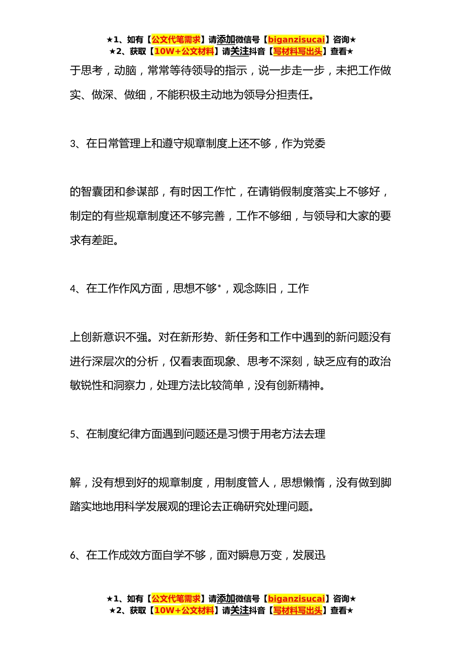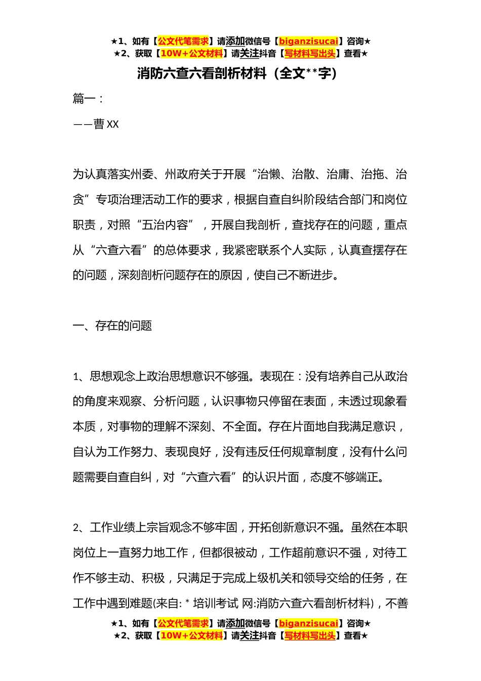 ★1、如有【公文代笔需求】请添加微信号【biganzisucai】咨询★★2、获取【10W+公文材料】请关注抖音【写材料写出头】查看★消防六查六看剖析材料(全文**字)篇一:——曹XX为认真落实州委、州政府关于开展“治懒、治散、治庸、治拖、治贪”专项治理活动工作的要求,根据自查自纠阶段结合部门和岗位职责,对照“五治内容”,开展自我剖析,查找存在的问题,重点从“六查六看”的总体要求,我紧密联系个人实际,认真查摆存在的问题,深刻剖析问题存在的原因,使自己不断进步。一、存在的问题1、思想观念上政治思想意识不够强。表现在:没有培养自己从政治的角度来观察、分析问题,认识事物只停留在表面,未透过现象看本质,对事物的理解不深刻、不全面。存在片面地自我满足意识,自认为工作努力、表现良好,没有违...