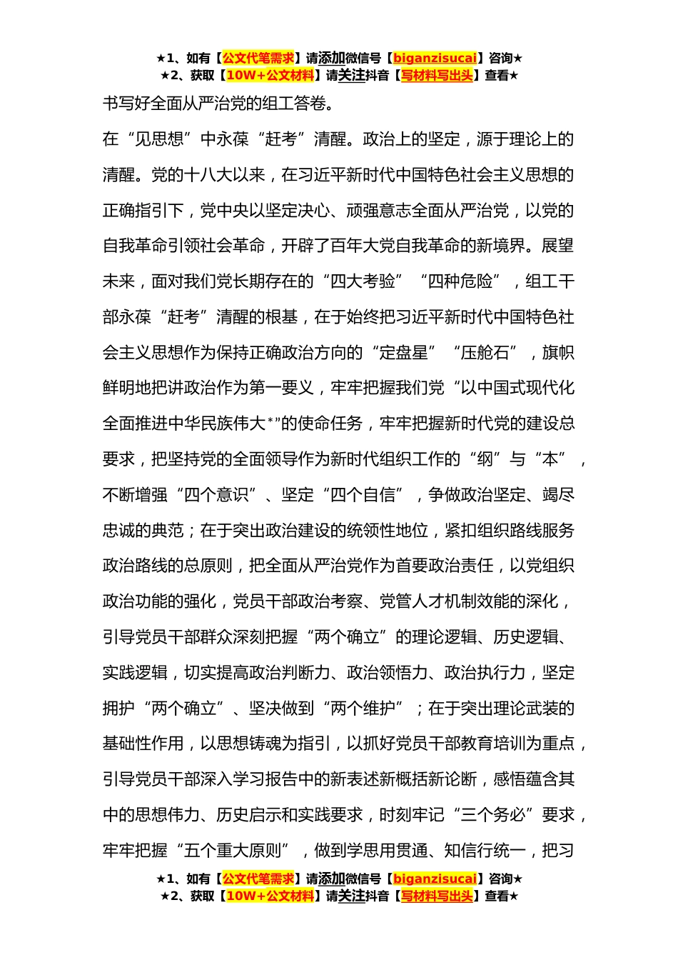 ★1、如有【公文代笔需求】请添加微信号【biganzisucai】咨询★★2、获取【10W+公文材料】请关注抖音【写材料写出头】查看★组织部长在市委常委会上的发言同志们:按照**召开**年民主生活相关要求,会前我认真学习了党的二十大精神,原原本本、逐字逐句学习党的二十大报告和党章,认真学习习近平总书记在党的二十届一中全会上的重要讲话精神,紧紧围绕“七个聚焦”,坚持把学习党的二十大报告与学习大会系列讲话和相关文件结合起来,与实际工作结合起来,认真领悟党的二十大提出的新思想新论断、作出的新部署新要求,真正把各项工作要求落到实处。同时,我还认真学习了党章、《中国共产党党内监督条例》和党中央关于民主生活会的有关要求,提高认识、统一思想、增强自觉,为开好民主生活会打牢坚实思想基础,现简...