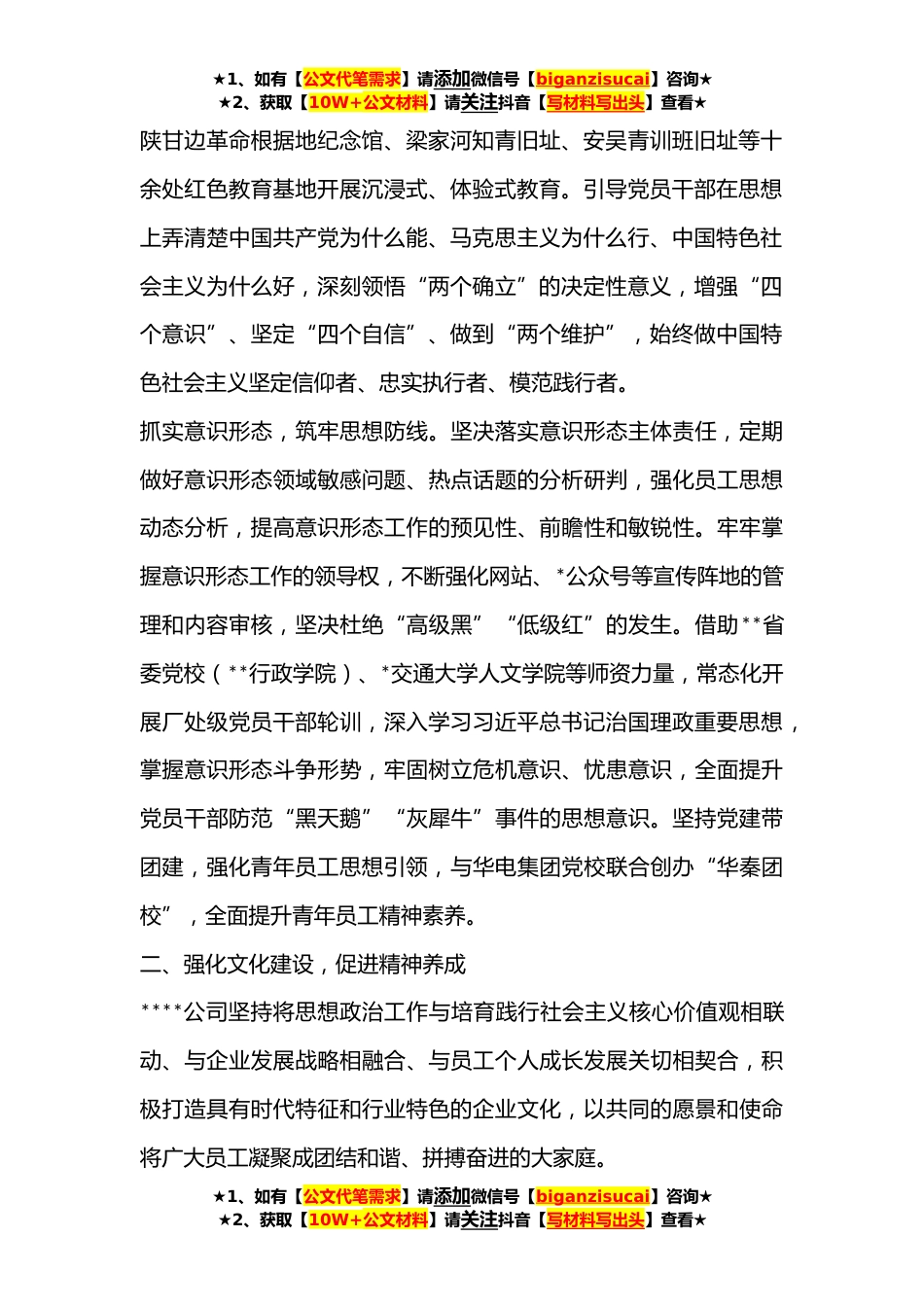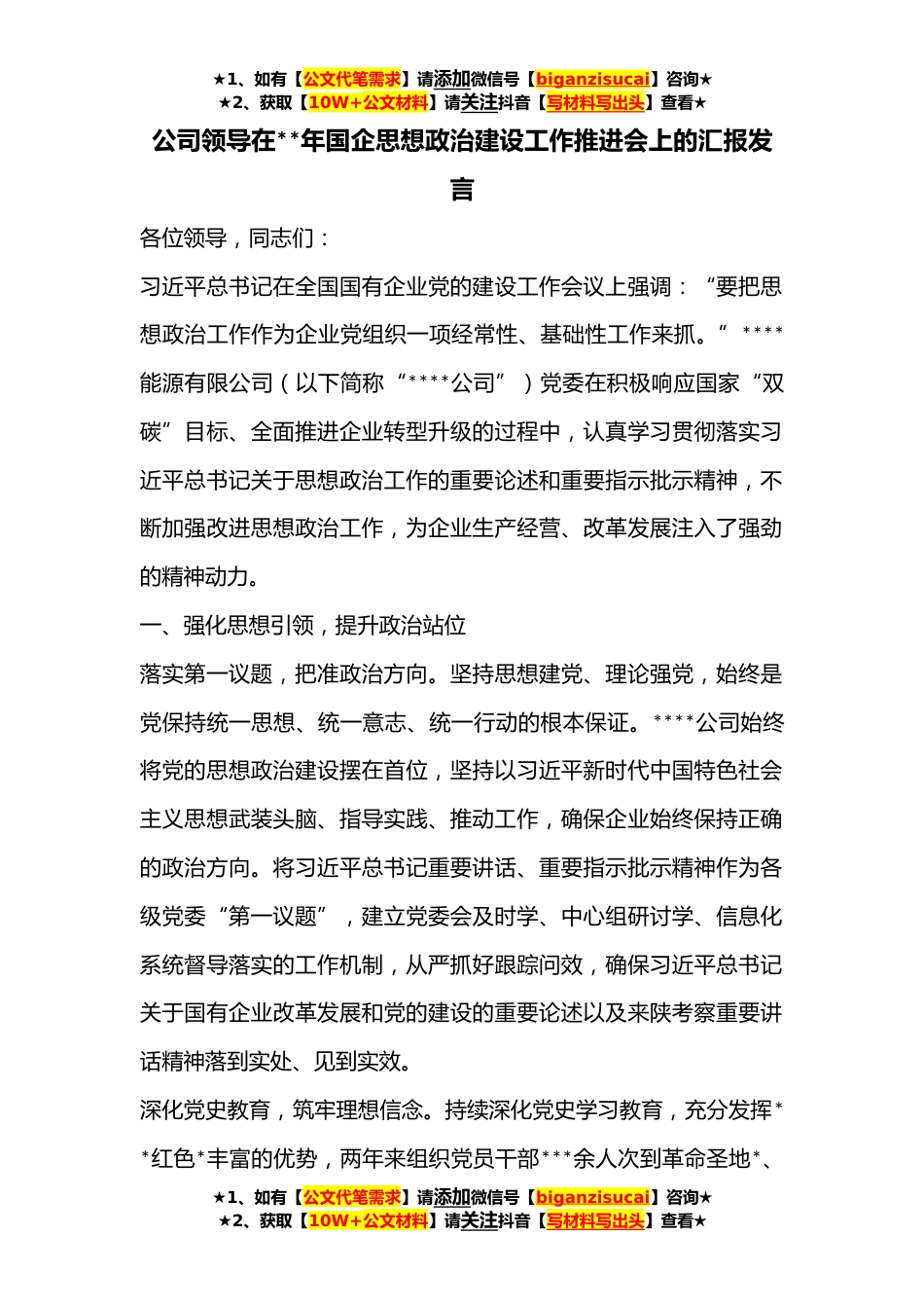 ★1、如有【公文代笔需求】请添加微信号【biganzisucai】咨询★★2、获取【10W+公文材料】请关注抖音【写材料写出头】查看★公司领导在**年国企思想政治建设工作推进会上的汇报发言各位领导,同志们:习近平总书记在全国国有企业党的建设工作会议上强调:“要把思想政治工作作为企业党组织一项经常性、基础性工作来抓。”****能源有限公司(以下简称“****公司”)党委在积极响应国家“双碳”目标、全面推进企业转型升级的过程中,认真学习贯彻落实习近平总书记关于思想政治工作的重要论述和重要指示批示精神,不断加强改进思想政治工作,为企业生产经营、改革发展注入了强劲的精神动力。一、强化思想引领,提升政治站位落实第一议题,把准政治方向。坚持思想建党、理论强党,始终是党保持统一思想、统一意志、统...