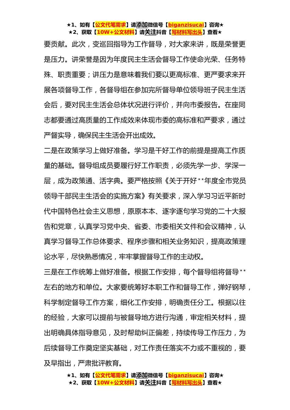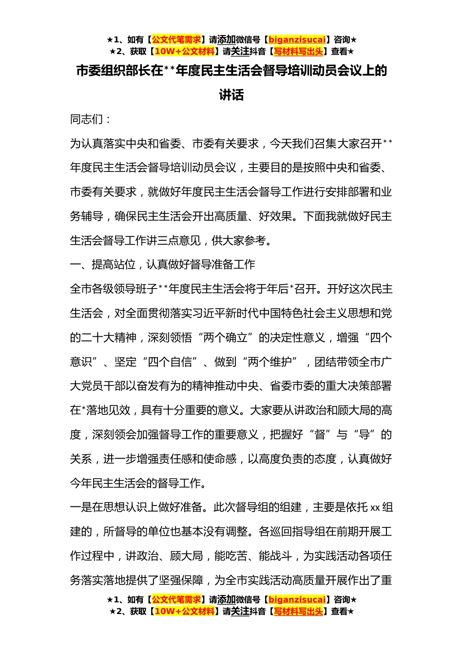 ★1、如有【公文代笔需求】请添加微信号【biganzisucai】咨询★★2、获取【10W+公文材料】请关注抖音【写材料写出头】查看★市委组织部长在**年度民主生活会督导培训动员会议上的讲话同志们:为认真落实中央和省委、市委有关要求,今天我们召集大家召开**年度民主生活会督导培训动员会议,主要目的是按照中央和省委、市委有关要求,就做好年度民主生活会督导工作进行安排部署和业务辅导,确保民主生活会开出高质量、好效果。下面我就做好民主生活会督导工作讲三点意见,供大家参考。一、提高站位,认真做好督导准备工作全市各级领导班子**年度民主生活会将于年后*召开。开好这次民主生活会,对全面贯彻落实习近平新时代中国特色社会主义思想和党的二十大精神,深刻领悟“两个确立”的决定性意义,增强“四个意识”...