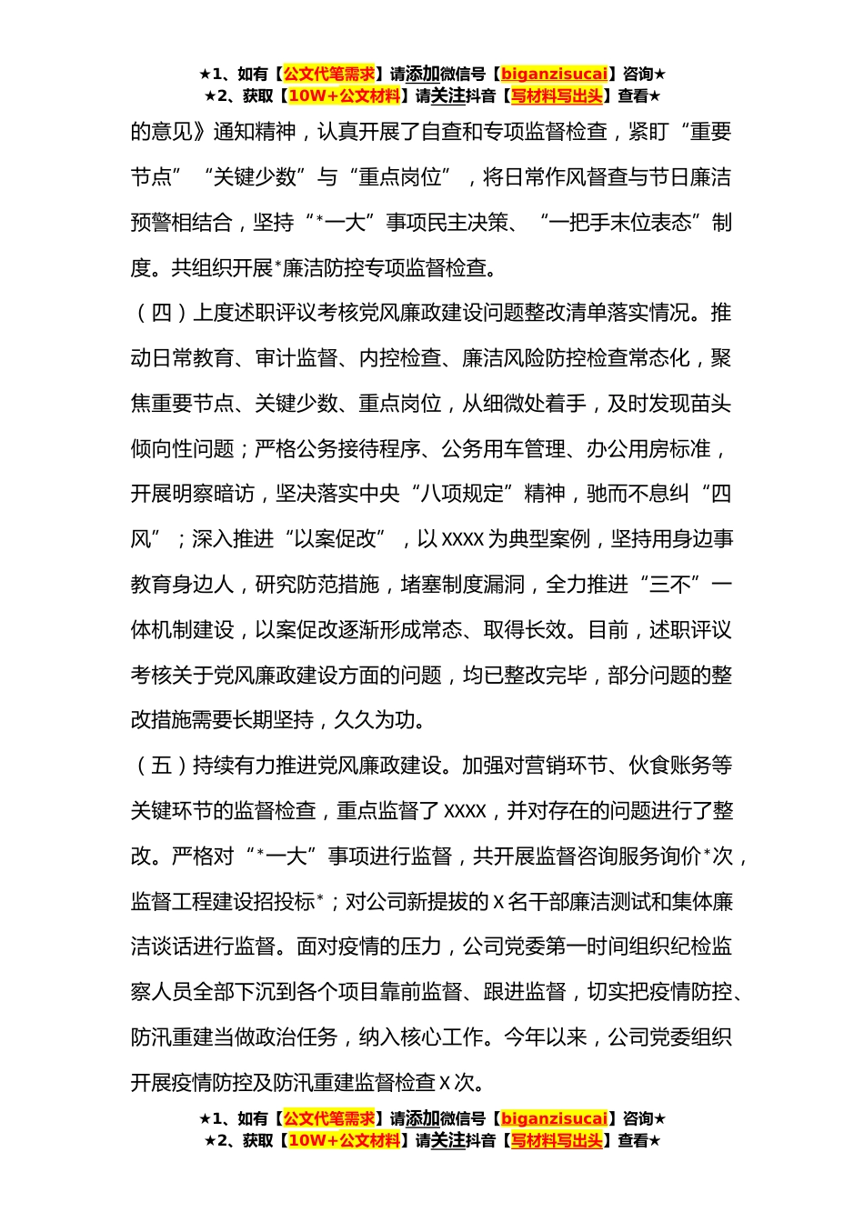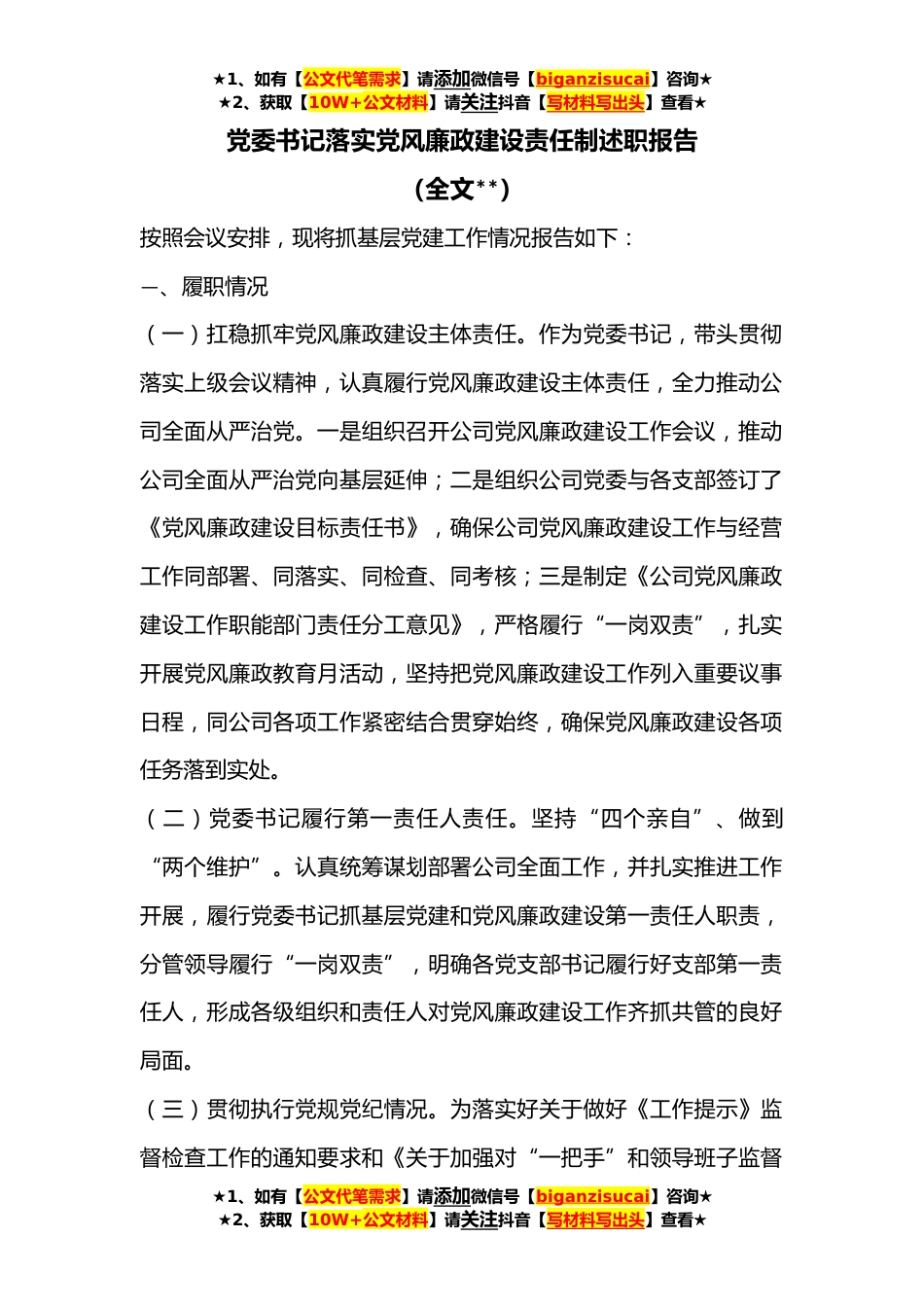 ★1、如有【公文代笔需求】请添加微信号【biganzisucai】咨询★★2、获取【10W+公文材料】请关注抖音【写材料写出头】查看★党委书记落实党风廉政建设责任制述职报告(全文**)按照会议安排,现将抓基层党建工作情况报告如下:—、履职情况(一)扛稳抓牢党风廉政建设主体责任。作为党委书记,带头贯彻落实上级会议精神,认真履行党风廉政建设主体责任,全力推动公司全面从严治党。一是组织召开公司党风廉政建设工作会议,推动公司全面从严治党向基层延伸;二是组织公司党委与各支部签订了《党风廉政建设目标责任书》,确保公司党风廉政建设工作与经营工作同部署、同落实、同检查、同考核;三是制定《公司党风廉政建设工作职能部门责任分工意见》,严格履行“一岗双责”,扎实开展党风廉政教育月活动,坚持把党风...