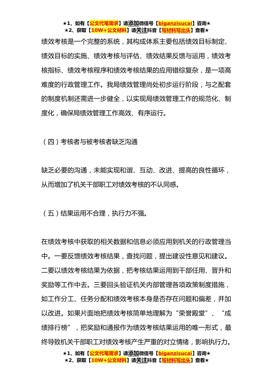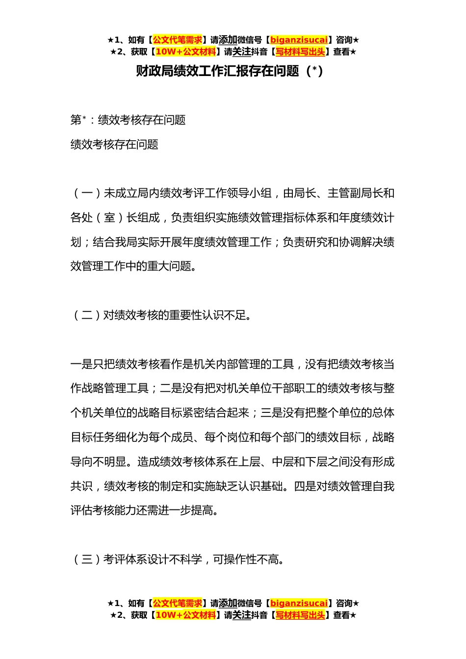 ★1、如有【公文代笔需求】请添加微信号【biganzisucai】咨询★★2、获取【10W+公文材料】请关注抖音【写材料写出头】查看★财政局绩效工作汇报存在问题(*)第*:绩效考核存在问题绩效考核存在问题(一)未成立局内绩效考评工作领导小组,由局长、主管副局长和各处(室)长组成,负责组织实施绩效管理指标体系和年度绩效计划;结合我局实际开展年度绩效管理工作;负责研究和协调解决绩效管理工作中的重大问题。(二)对绩效考核的重要性认识不足。一是只把绩效考核看作是机关内部管理的工具,没有把绩效考核当作战略管理工具;二是没有把对机关单位干部职工的绩效考核与整个机关单位的战略目标紧密结合起来;三是没有把整个单位的总体目标任务细化为每个成员、每个岗位和每个部门的绩效目标,战略导向不明显。造...