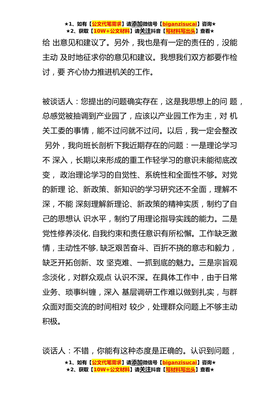 ★1、如有【公文代笔需求】请添加微信号【biganzisucai】咨询★★2、获取【10W+公文材料】请关注抖音【写材料写出头】查看★**年基层党组织组织生活会谈心谈话记录(*)组织生活会谈心谈话记录(一)谈话时间:**年*月*日谈话地点:单位党员活动室谈话人员:***谈话内容:***谈话人:根据县纪委、组织部的要求,按照生活会召开程序,今天我作为班长,与你谈谈心。你被县政府抽调到产业园工作,产业园近年来的工作有很大突破,连续两年税收突破*亿元*,说明你的工作能力是非常强的。但是,不足之处,就是对我们机关的工作关心的少了,也没有主动★1、如有【公文代笔需求】请添加微信号【biganzisucai】咨询★★2、获取【10W+公文材料】请关注抖音【写材料写出头】查看★★1、如有【公文代笔需求】请添加微信号【big...