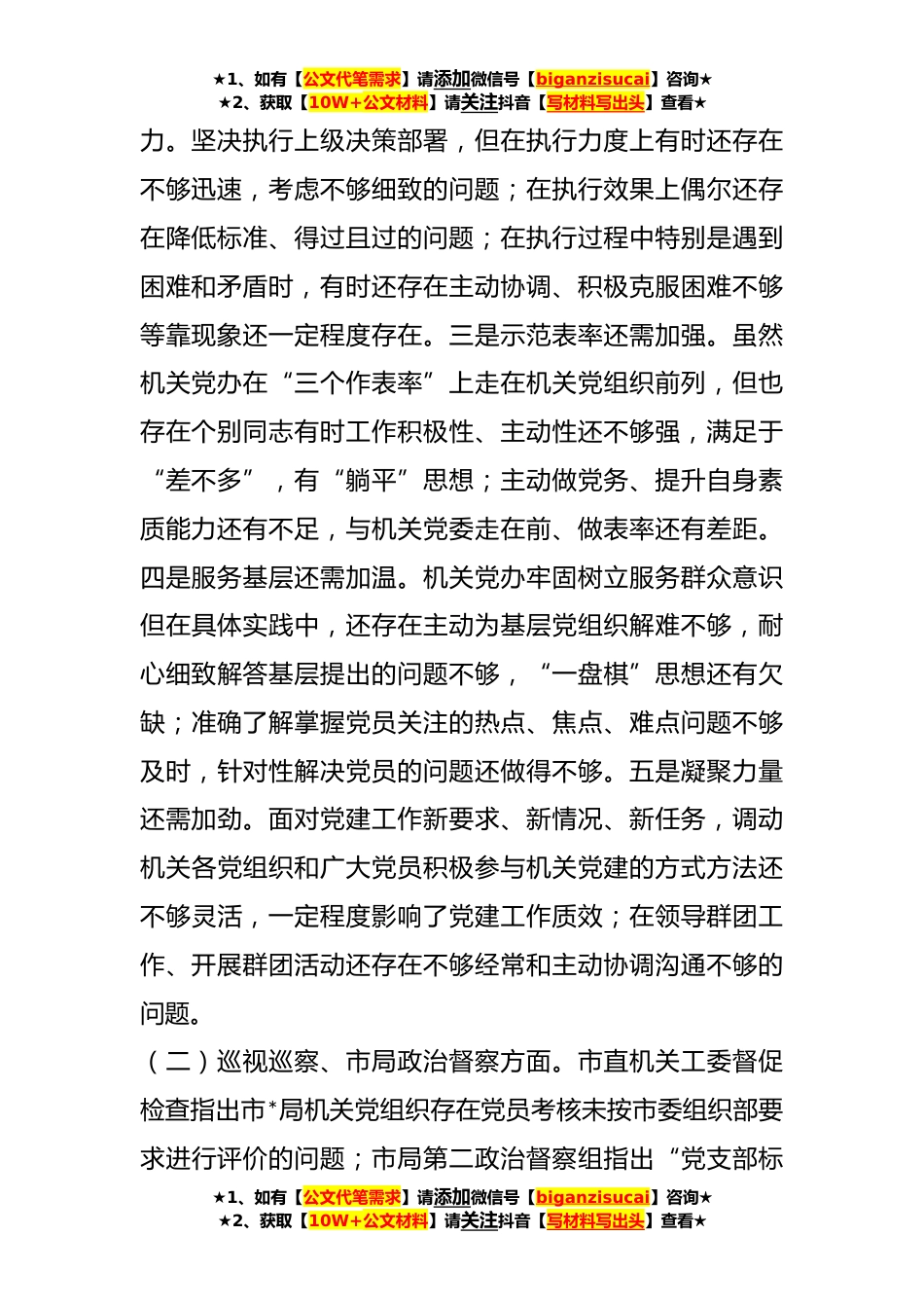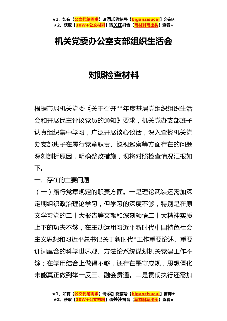 ★1、如有【公文代笔需求】请添加微信号【biganzisucai】咨询★★2、获取【10W+公文材料】请关注抖音【写材料写出头】查看★机关党委办公室支部组织生活会对照检查材料根据市局机关党委《关于召开**年度基层党组织组织生活会和开展民主评议党员的通知》要求,机关党办支部班子认真组织集中学习,广泛开展谈心谈话,深入查找机关党办支部班子在履行党章职责、巡视巡察等方面存在的问题深刻剖析原因,明确整改措施,现将对照检查情况汇报如下。一、存在的主要问题(一)履行党章规定的职责方面。一是理论武装还需加深定期组织政治理论学习,但学习的深度不够,特别是在原文学习党的二十大报告等文献和深刻领悟二十大精神实质上下的功夫不够,在主动运用习近平新时代中国特色社会主义思想和习近平总书记关于新时代*工...