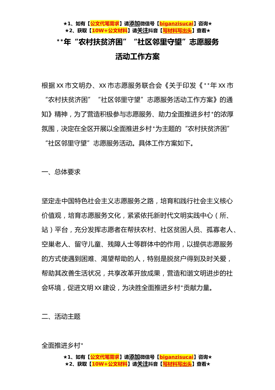 ★1、如有【公文代笔需求】请添加微信号【biganzisucai】咨询★★2、获取【10W+公文材料】请关注抖音【写材料写出头】查看★**年“农村扶贫济困”“社区邻里守望”志愿服务活动工作方案根据XX市文明办、XX市志愿服务联合会《关于印发《**年XX市“农村扶贫济困”“社区邻里守望”志愿服务活动工作方案》的通知》精神,为了营造积极参与志愿服务、助力全面推进乡村*的浓厚氛围,决定在全区开展以全面推进乡村*为主题的“农村扶贫济困”“社区邻里守望”志愿服务活动。具体工作方案如下。一、总体要求坚定走中国特色社会主义志愿服务之路,培育和践行社会主义核心价值观,培育志愿服务文化,紧紧依托新时代文明实践中心(所、站)平台,充分发挥志愿者在帮扶农村、社区贫困人员、孤寡老人、空巢老人、留守儿童、残障...