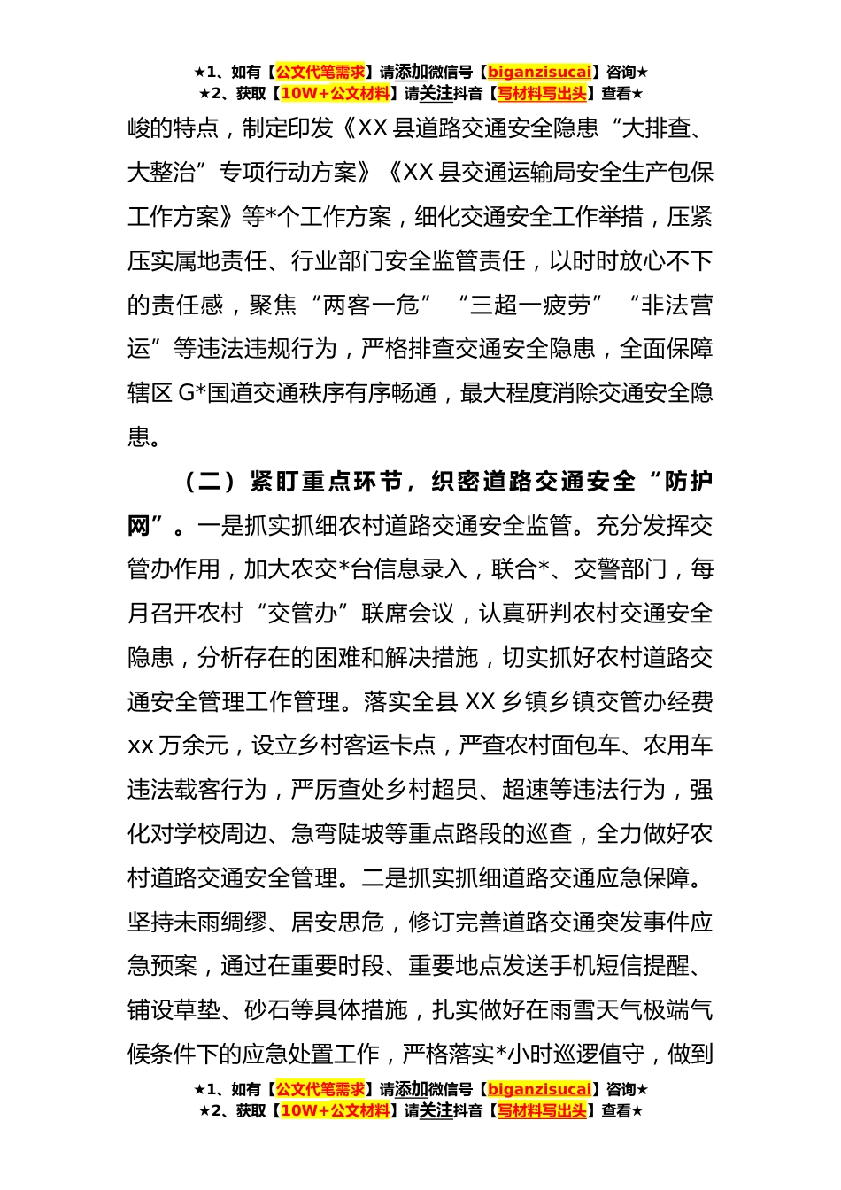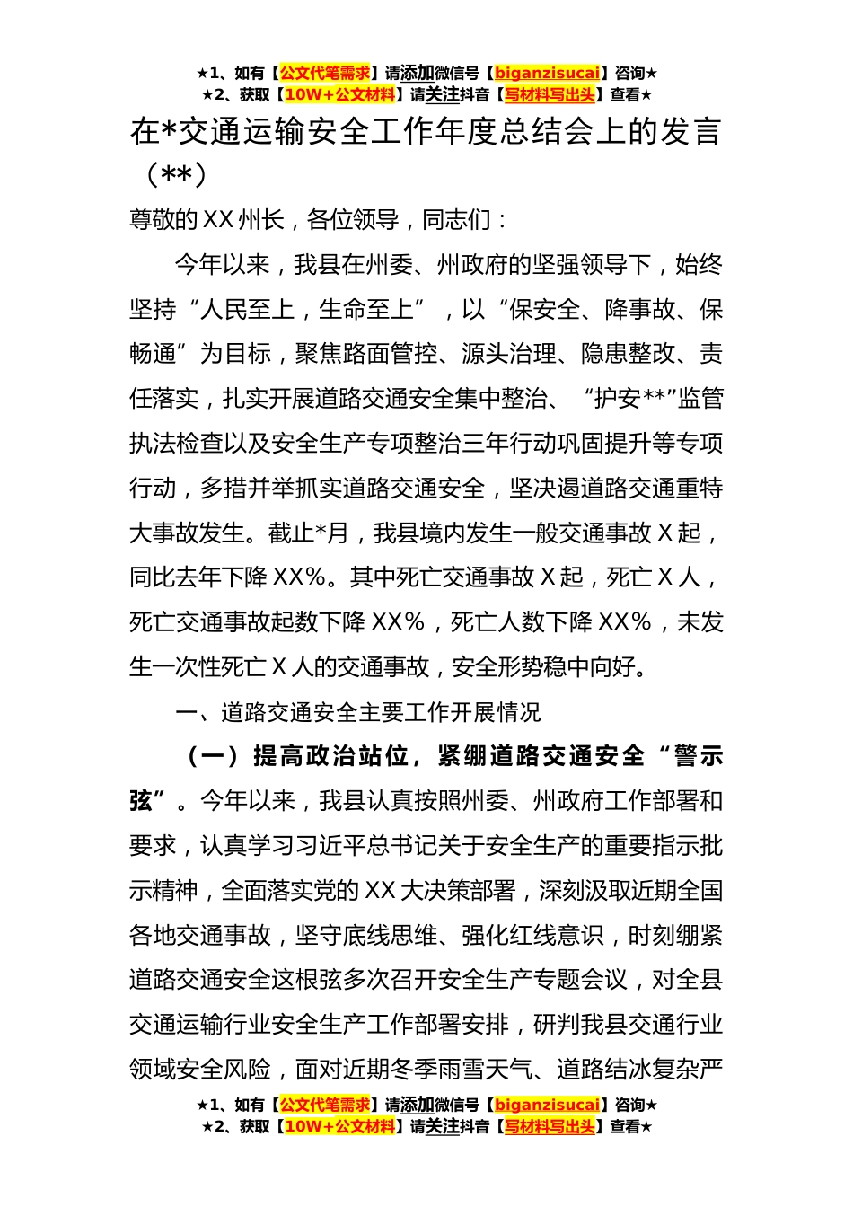 ★1、如有【公文代笔需求】请添加微信号【biganzisucai】咨询★★2、获取【10W+公文材料】请关注抖音【写材料写出头】查看★在*交通运输安全工作年度总结会上的发言(**)尊敬的XX州长,各位领导,同志们:今年以来,我县在州委、州政府的坚强领导下,始终坚持“人民至上,生命至上”,以“保安全、降事故、保畅通”为目标,聚焦路面管控、源头治理、隐患整改、责任落实,扎实开展道路交通安全集中整治、“护安**”监管执法检查以及安全生产专项整治三年行动巩固提升等专项行动,多措并举抓实道路交通安全,坚决遏道路交通重特大事故发生。截止*月,我县境内发生一般交通事故X起,同比去年下降XX%。其中死亡交通事故X起,死亡X人,死亡交通事故起数下降XX%,死亡人数下降XX%,未发生一次性死亡X人的交通事故,...