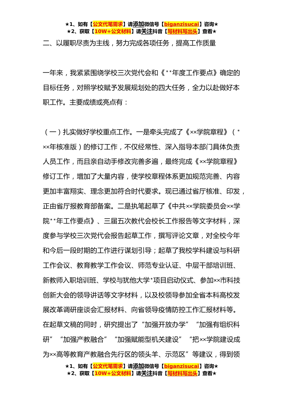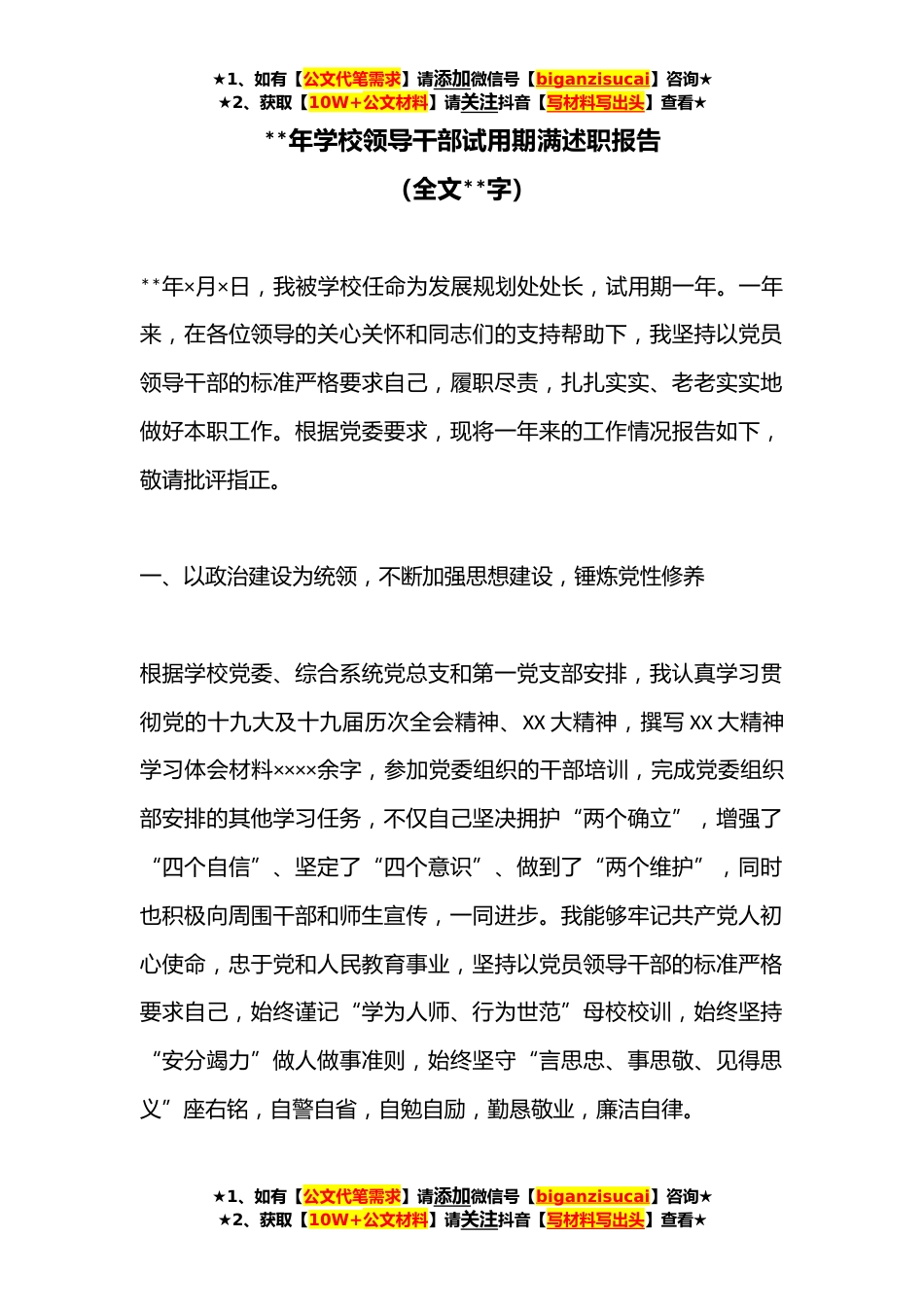 ★1、如有【公文代笔需求】请添加微信号【biganzisucai】咨询★★2、获取【10W+公文材料】请关注抖音【写材料写出头】查看★**年学校领导干部试用期满述职报告(全文**字)**年×月×日,我被学校任命为发展规划处处长,试用期一年。一年来,在各位领导的关心关怀和同志们的支持帮助下,我坚持以党员领导干部的标准严格要求自己,履职尽责,扎扎实实、老老实实地做好本职工作。根据党委要求,现将一年来的工作情况报告如下,敬请批评指正。一、以政治建设为统领,不断加强思想建设,锤炼党性修养根据学校党委、综合系统党总支和第一党支部安排,我认真学习贯彻党的十九大及十九届历次全会精神、XX大精神,撰写XX大精神学习体会材料××××余字,参加党委组织的干部培训,完成党委组织部安排的其他学习任务,不仅...