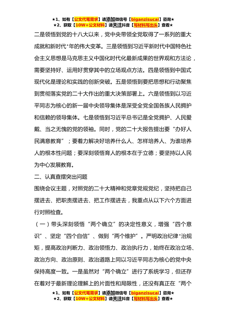 ★1、如有【公文代笔需求】请添加微信号【biganzisucai】咨询★★2、获取【10W+公文材料】请关注抖音【写材料写出头】查看★中(小)学校长**年度民主生活会对照检查发言提纲(全文**)按照民主生活会方案的总体部署以及﹡党委统一安排,我通过集中研讨和个人自学等形式,系统学习了习近平新时代中国特色社会主义思想和党的二十大精神,着重学习了习近平总书记在参加*省代表团讨论时提出的“五个牢牢把握”重要要求,深刻领悟了“两个确立”的决定性意义,深刻理解了党的二十大对全面建设社会主义现代化国家作出的战略部署,切实把思想和行动统一到党中央精神上来,进一步增强“四个意识”、坚定“四个自信”、做到“两个维护”,为开好民主生活会打下了良好的思想基础。同时,我主动与学校主要负责人、班子成员、...