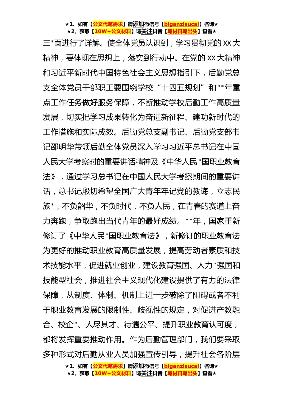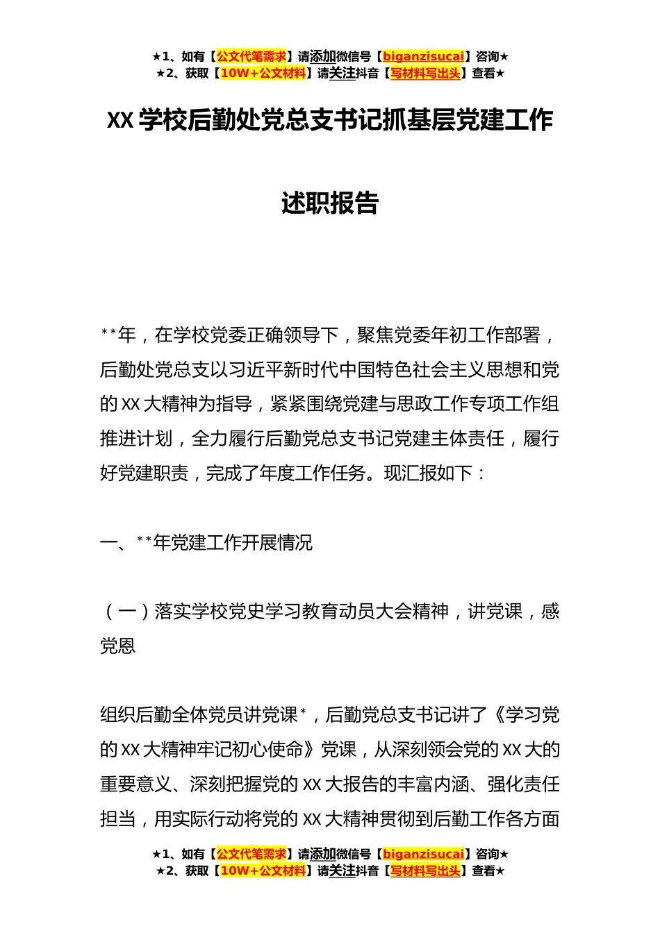 ★1、如有【公文代笔需求】请添加微信号【biganzisucai】咨询★★2、获取【10W+公文材料】请关注抖音【写材料写出头】查看★XX学校后勤处党总支书记抓基层党建工作述职报告**年,在学校党委正确领导下,聚焦党委年初工作部署,后勤处党总支以习近平新时代中国特色社会主义思想和党的XX大精神为指导,紧紧围绕党建与思政工作专项工作组推进计划,全力履行后勤党总支书记党建主体责任,履行好党建职责,完成了年度工作任务。现汇报如下:一、**年党建工作开展情况(一)落实学校党史学习教育动员大会精神,讲党课,感党恩组织后勤全体党员讲党课*,后勤党总支书记讲了《学习党的XX大精神牢记初心使命》党课,从深刻领会党的XX大的重要意义、深刻把握党的XX大报告的丰富内涵、强化责任担当,用实际行动将党的XX大精神...