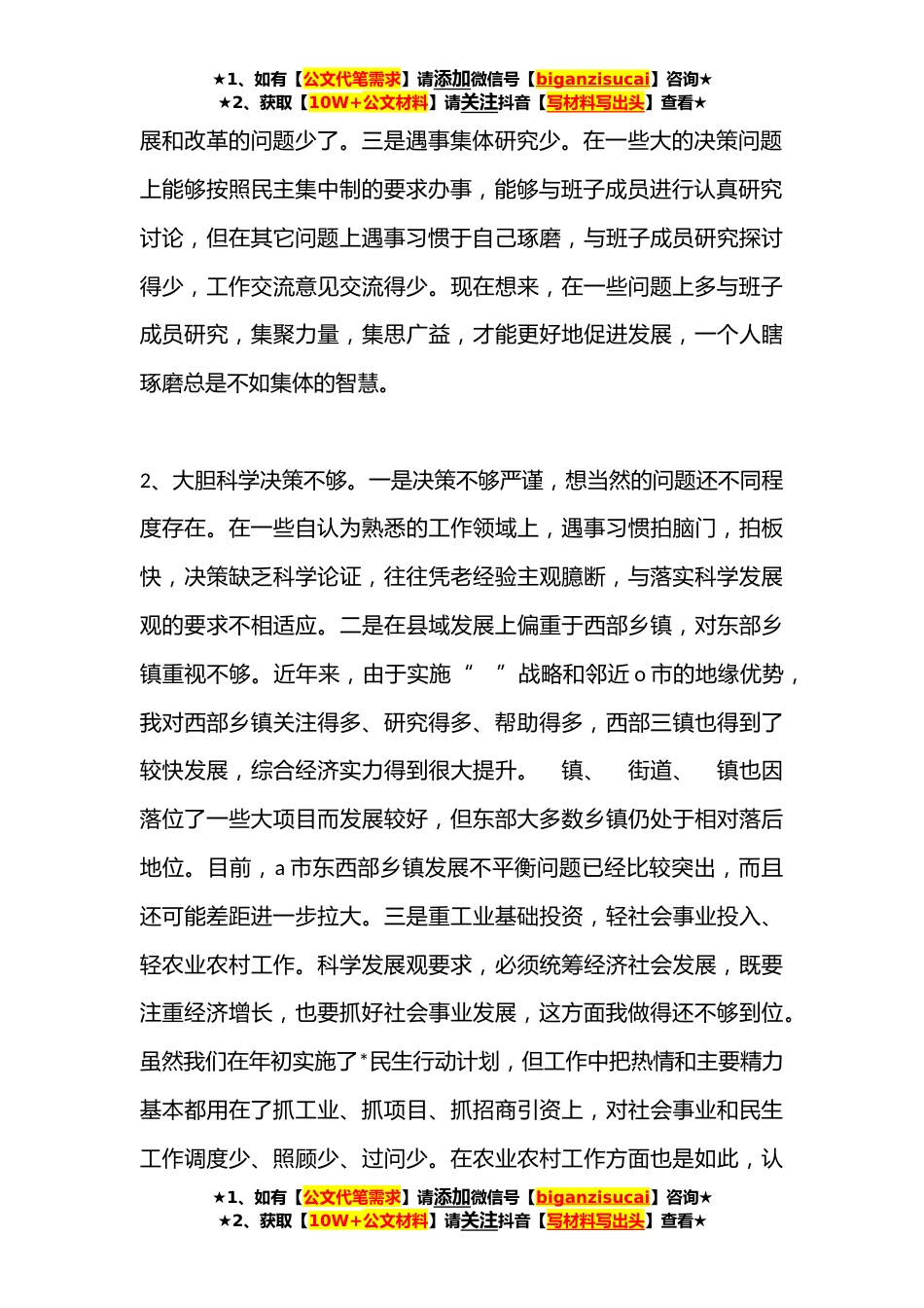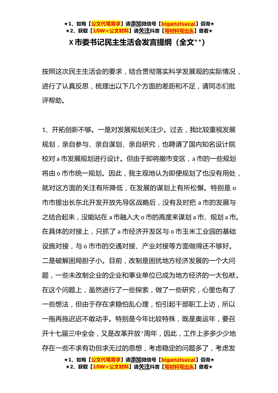 ★1、如有【公文代笔需求】请添加微信号【biganzisucai】咨询★★2、获取【10W+公文材料】请关注抖音【写材料写出头】查看★X市委书记民主生活会发言提纲(全文**)按照这次民主生活会的要求,结合贯彻落实科学发展观的实际情况,进行了认真反思,梳理出以下几个方面的差距和不足,请同志们批评帮助。1、开拓创新不够。一是对发展规划关注少。过去,我比较重视发展规划,亲自参与、亲自谋划、亲自研究,也聘请了国内知名设计院校对a市发展规划进行设计。但由于即将撤市变区,a市的一些规划将由o市市统一规划。因此,我主观地认为即便规划了也没有用处,就对这方面的关注有所降低,在发展的谋划上有所松懈。特别是o市市提出长东北开发开放先导区战略后,没有及时把a市的发展与之结合起来,没能站在a市融入大o市的高...