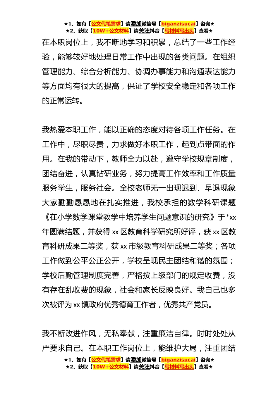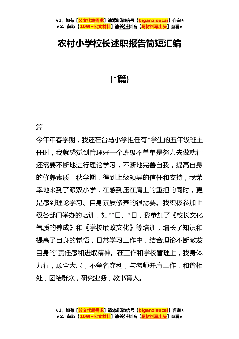 ★1、如有【公文代笔需求】请添加微信号【biganzisucai】咨询★★2、获取【10W+公文材料】请关注抖音【写材料写出头】查看★农村小学校长述职报告简短汇编(*篇)篇一今年年春学期,我还在台马小学担任有*学生的五年级班主任时,我就感觉到管理好一个班级不单单是努力去做就行还需要不断地进行理论学习,不断地完善自我,提高自身的修养素质。秋学期,得到上级领导的信任和支持,我荣幸地来到了派双小学,在感到压在肩上的重担的同时,更是感到理论学习、自身素质修养的很需要。我积极参加上级各部门举办的培训,如**日、*日,我参加了《校长文化气质的养成》和《学校廉政文化》等培训,增长了知识和提高了自身的觉悟,日常学习工作中,结合理论不断激发自身的`责任感和进取精神。在工作和学校管理上,我身体力行,...