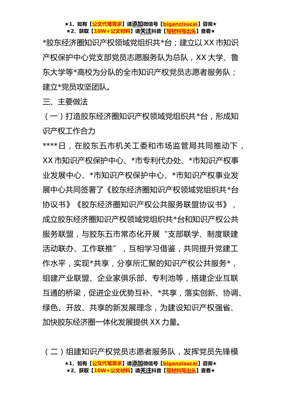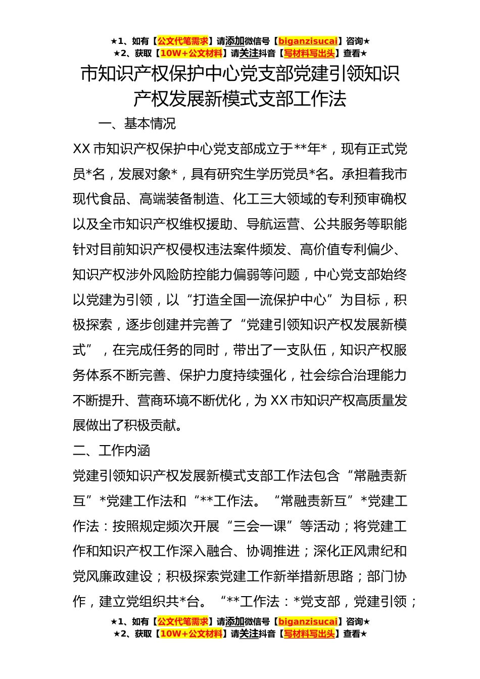 ★1、如有【公文代笔需求】请添加微信号【biganzisucai】咨询★★2、获取【10W+公文材料】请关注抖音【写材料写出头】查看★市知识产权保护中心党支部党建引领知识产权发展新模式支部工作法一、基本情况XX市知识产权保护中心党支部成立于**年*,现有正式党员*名,发展对象*,具有研究生学历党员*名。承担着我市现代食品、高端装备制造、化工三大领域的专利预审确权以及全市知识产权维权援助、导航运营、公共服务等职能针对目前知识产权侵权违法案件频发、高价值专利偏少、知识产权涉外风险防控能力偏弱等问题,中心党支部始终以党建为引领,以“打造全国一流保护中心”为目标,积极探索,逐步创建并完善了“党建引领知识产权发展新模式”,在完成任务的同时,带出了一支队伍,知识产权服务体系不断完善、保护力度...