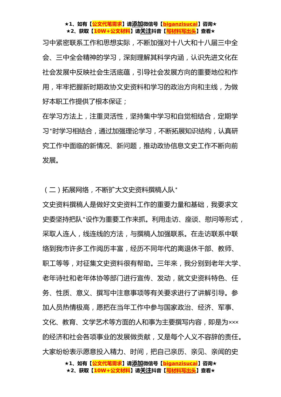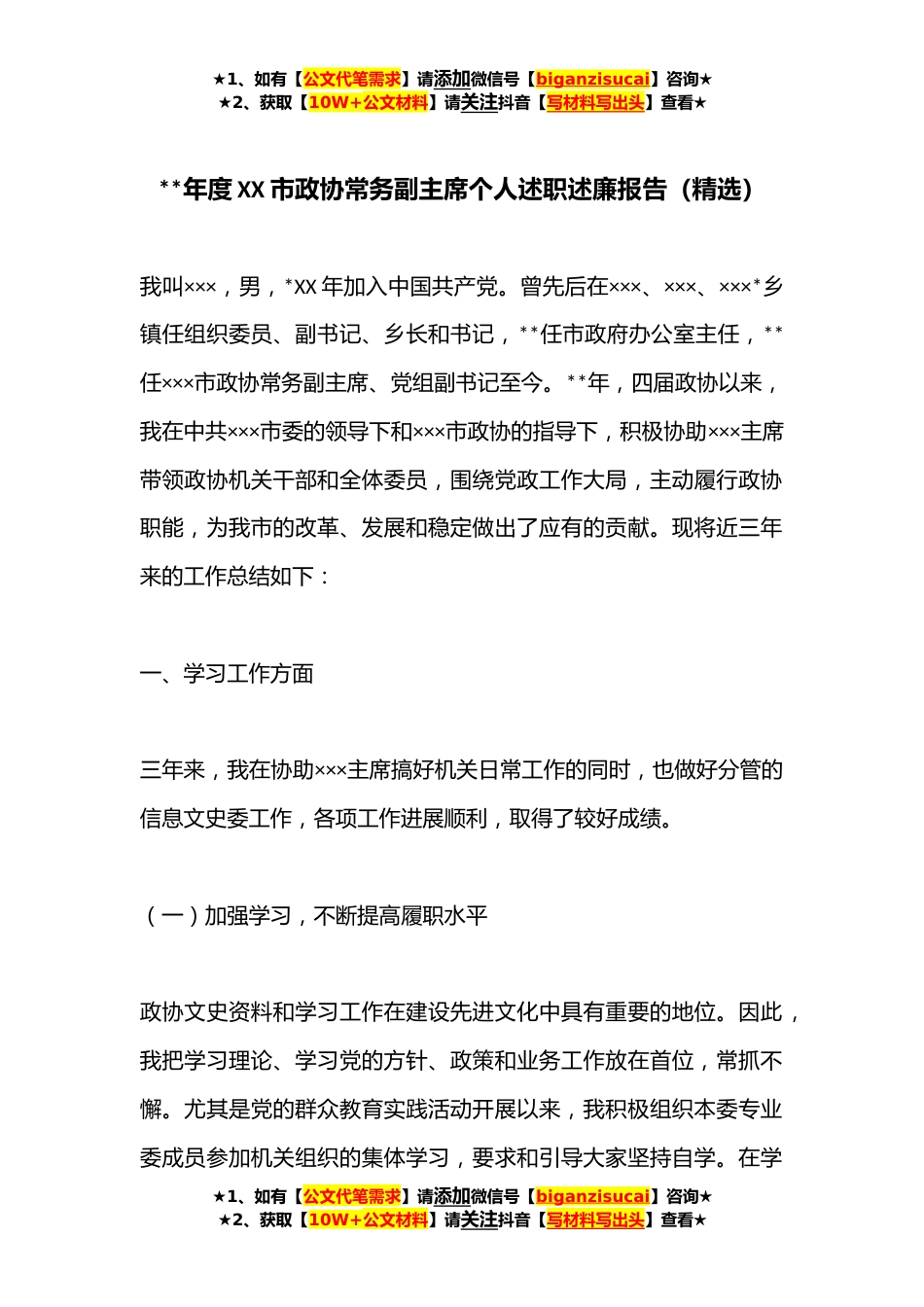 ★1、如有【公文代笔需求】请添加微信号【biganzisucai】咨询★★2、获取【10W+公文材料】请关注抖音【写材料写出头】查看★**年度XX市政协常务副主席个人述职述廉报告(精选)我叫×××,男,*XX年加入中国共产党。曾先后在×××、×××、×××*乡镇任组织委员、副书记、乡长和书记,**任市政府办公室主任,**任×××市政协常务副主席、党组副书记至今。**年,四届政协以来,我在中共×××市委的领导下和×××市政协的指导下,积极协助×××主席带领政协机关干部和全体委员,围绕党政工作大局,主动履行政协职能,为我市的改革、发展和稳定做出了应有的贡献。现将近三年来的工作总结如下:一、学习工作方面三年来,我在协助×××主席搞好机关日常工作的同时,也做好分管的信息文史委工作,各项工作进展...