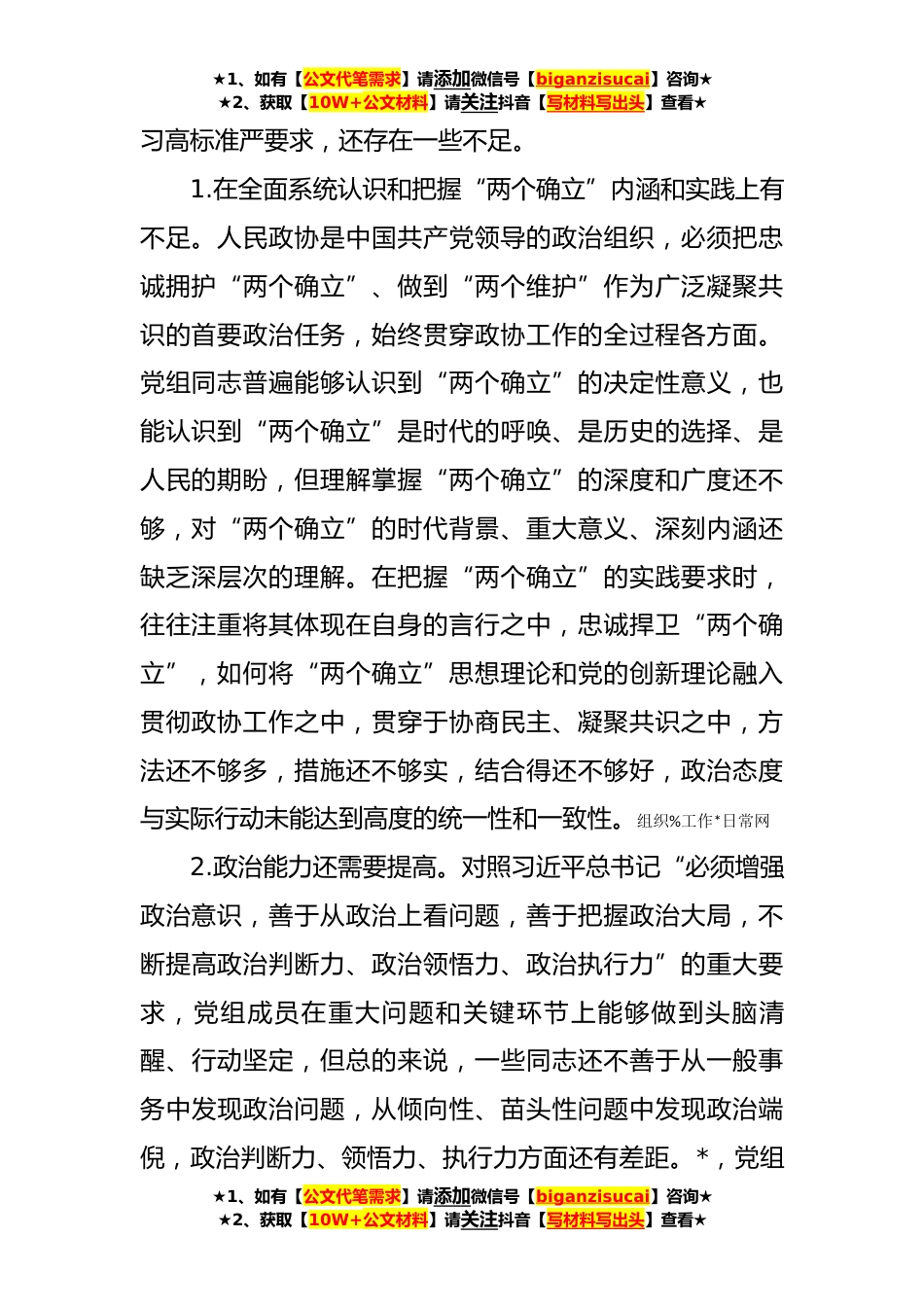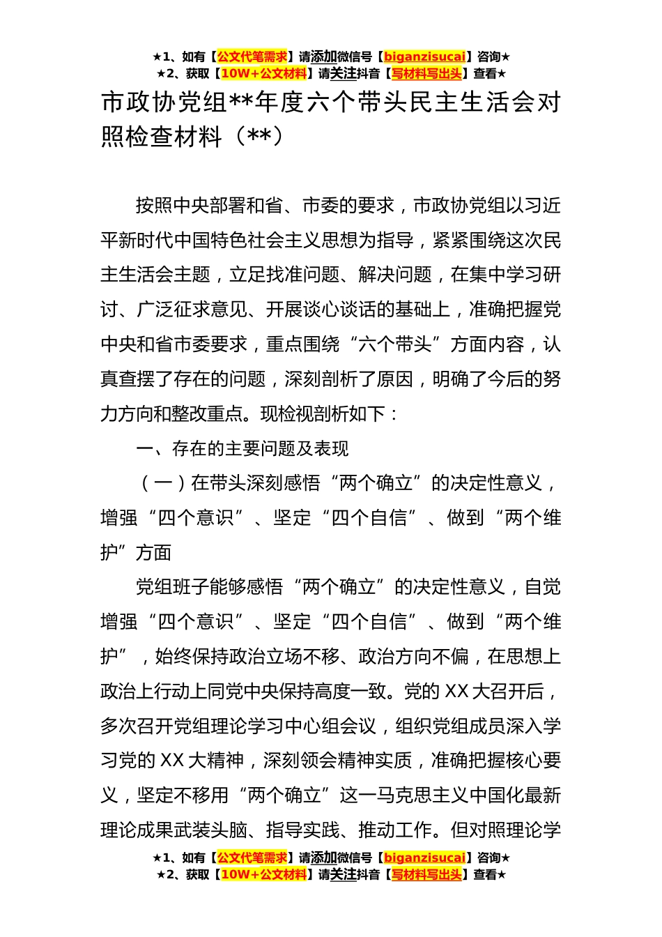 ★1、如有【公文代笔需求】请添加微信号【biganzisucai】咨询★★2、获取【10W+公文材料】请关注抖音【写材料写出头】查看★市政协党组**年度六个带头民主生活会对照检查材料(**)按照中央部署和省、市委的要求,市政协党组以习近平新时代中国特色社会主义思想为指导,紧紧围绕这次民主生活会主题,立足找准问题、解决问题,在集中学习研讨、广泛征求意见、开展谈心谈话的基础上,准确把握党中央和省市委要求,重点围绕“六个带头”方面内容,认真查摆了存在的问题,深刻剖析了原因,明确了今后的努力方向和整改重点。现检视剖析如下:一、存在的主要问题及表现(一)在带头深刻感悟“两个确立”的决定性意义,增强“四个意识”、坚定“四个自信”、做到“两个维护”方面党组班子能够感悟“两个确立”的决定性意...