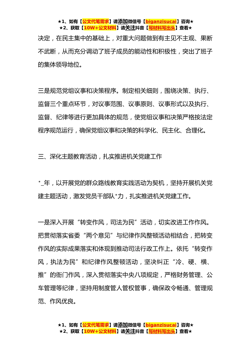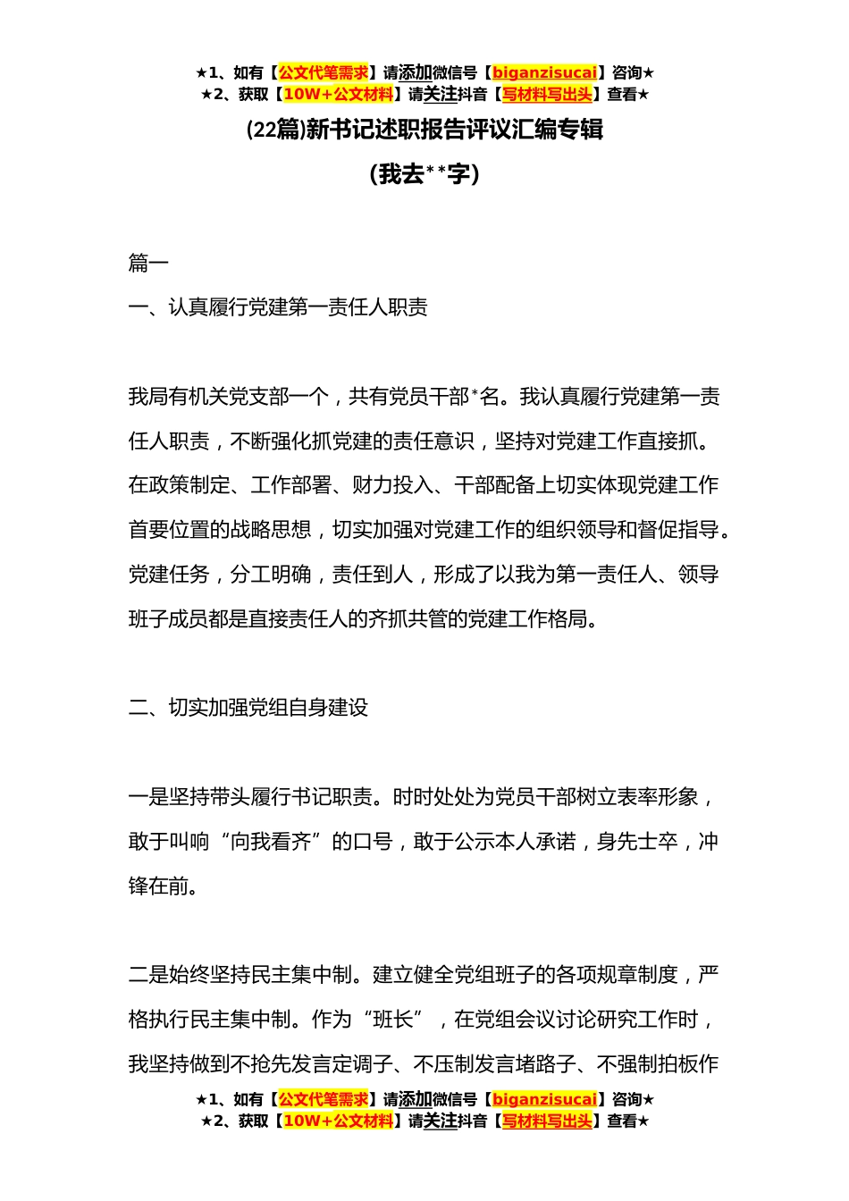 ★1、如有【公文代笔需求】请添加微信号【biganzisucai】咨询★★2、获取【10W+公文材料】请关注抖音【写材料写出头】查看★(22篇)新书记述职报告评议汇编专辑(我去**字)篇一一、认真履行党建第一责任人职责我局有机关党支部一个,共有党员干部*名。我认真履行党建第一责任人职责,不断强化抓党建的责任意识,坚持对党建工作直接抓。在政策制定、工作部署、财力投入、干部配备上切实体现党建工作首要位置的战略思想,切实加强对党建工作的组织领导和督促指导。党建任务,分工明确,责任到人,形成了以我为第一责任人、领导班子成员都是直接责任人的齐抓共管的党建工作格局。二、切实加强党组自身建设一是坚持带头履行书记职责。时时处处为党员干部树立表率形象,敢于叫响“向我看齐”的口号,敢于公示本人承诺,...