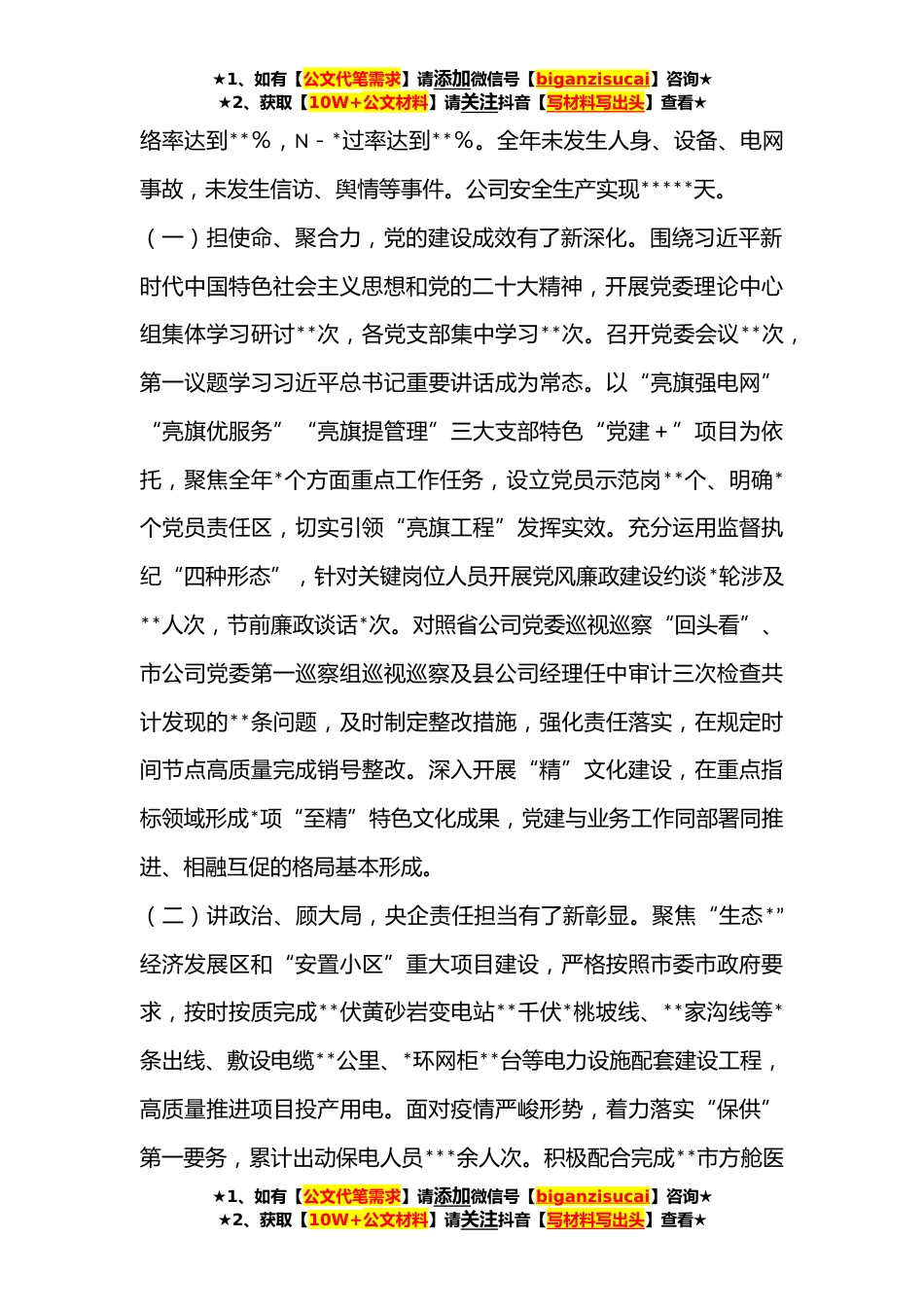 ★1、如有【公文代笔需求】请添加微信号【biganzisucai】咨询★★2、获取【10W+公文材料】请关注抖音【写材料写出头】查看★踔厉奋发担使命勇毅前行开新局奋力谱写公司高质量发展新篇章——在**年供电公司工作会议上的讲话各位代表、同志们:这次会议的主要任务是:以习近平新时代中国特色社会主义思想为指导,深入贯彻党的二十大精神,全面落实上级公司“两会”精神和区委区政府决策部署,总结**年工作经验,分析面临的形势和挑战,部署**年工作任务,踔厉奋发,勇毅前行,奋力谱写公司高质量发展新篇章,为服务地方经济社会发展作出更大贡献。下面,我向大会作工作报告,请各位代表审议。一、**年工作回顾**年,面对复*变的形势和艰巨繁重的发展任务,公司上下坚决贯彻落实省市公司战略部署,在市公司党委和区委...