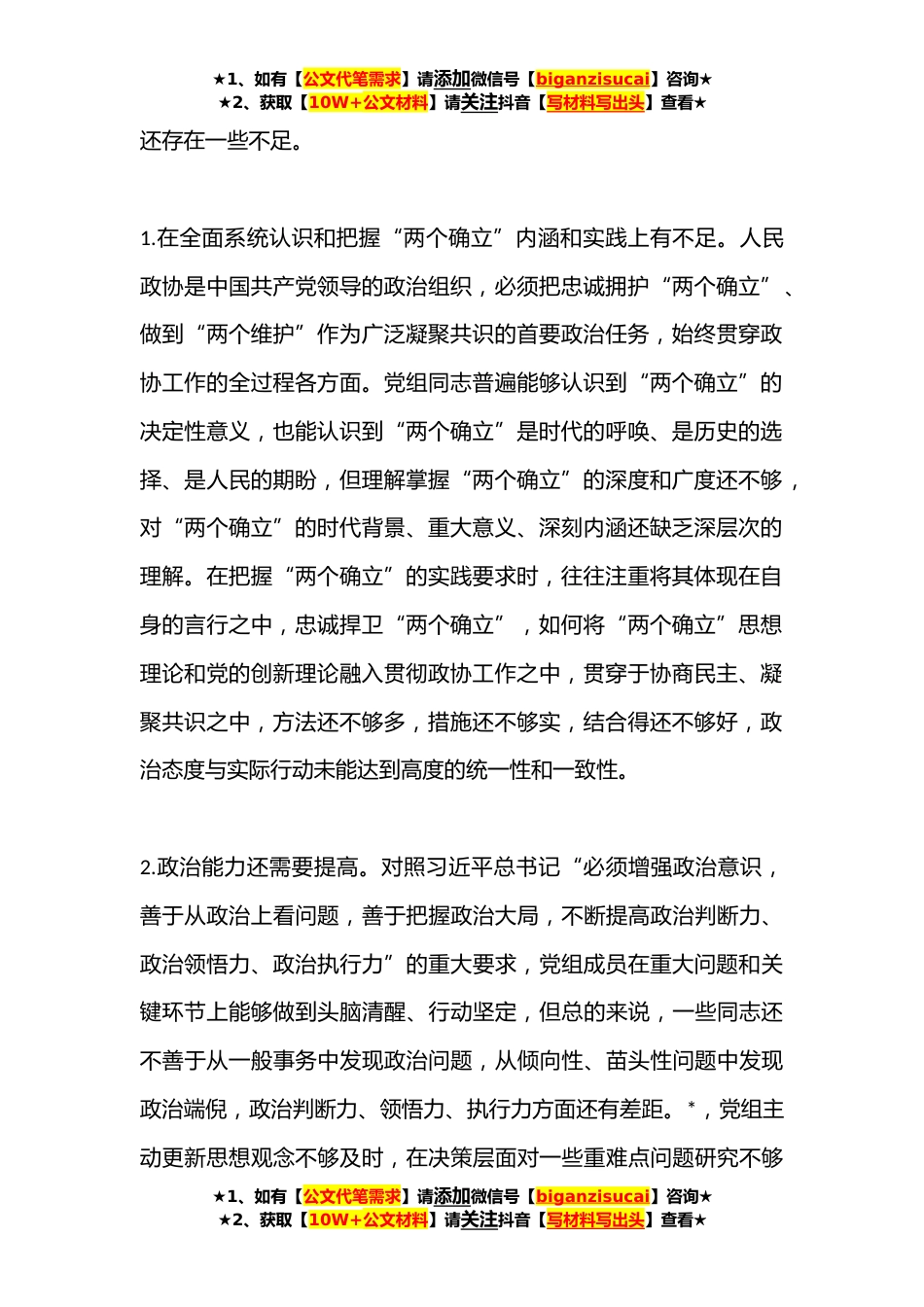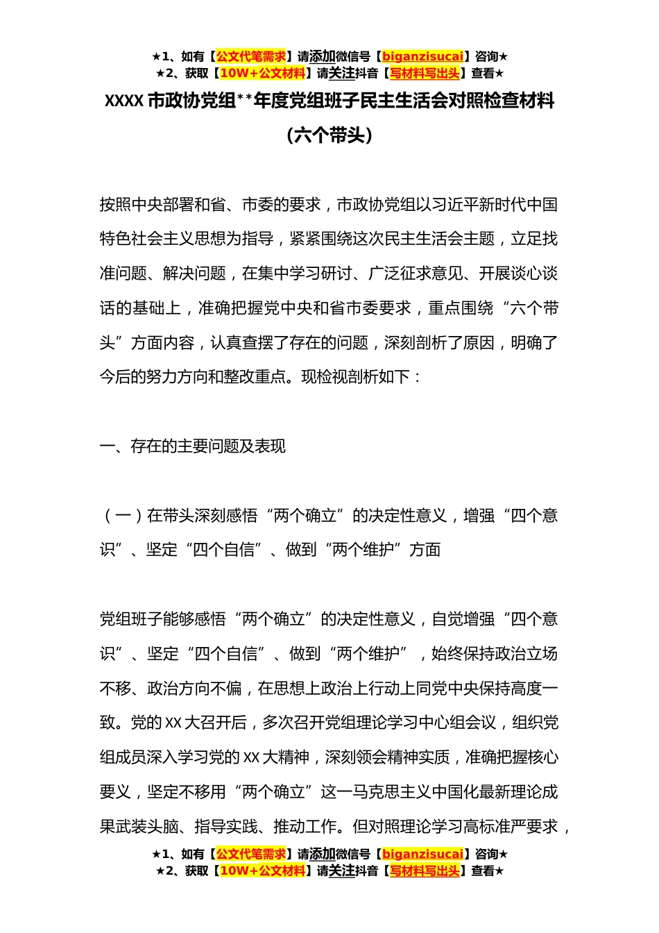 ★1、如有【公文代笔需求】请添加微信号【biganzisucai】咨询★★2、获取【10W+公文材料】请关注抖音【写材料写出头】查看★XXXX市政协党组**年度党组班子民主生活会对照检查材料(六个带头)按照中央部署和省、市委的要求,市政协党组以习近平新时代中国特色社会主义思想为指导,紧紧围绕这次民主生活会主题,立足找准问题、解决问题,在集中学习研讨、广泛征求意见、开展谈心谈话的基础上,准确把握党中央和省市委要求,重点围绕“六个带头”方面内容,认真查摆了存在的问题,深刻剖析了原因,明确了今后的努力方向和整改重点。现检视剖析如下:一、存在的主要问题及表现(一)在带头深刻感悟“两个确立”的决定性意义,增强“四个意识”、坚定“四个自信”、做到“两个维护”方面党组班子能够感悟“两个确立”...