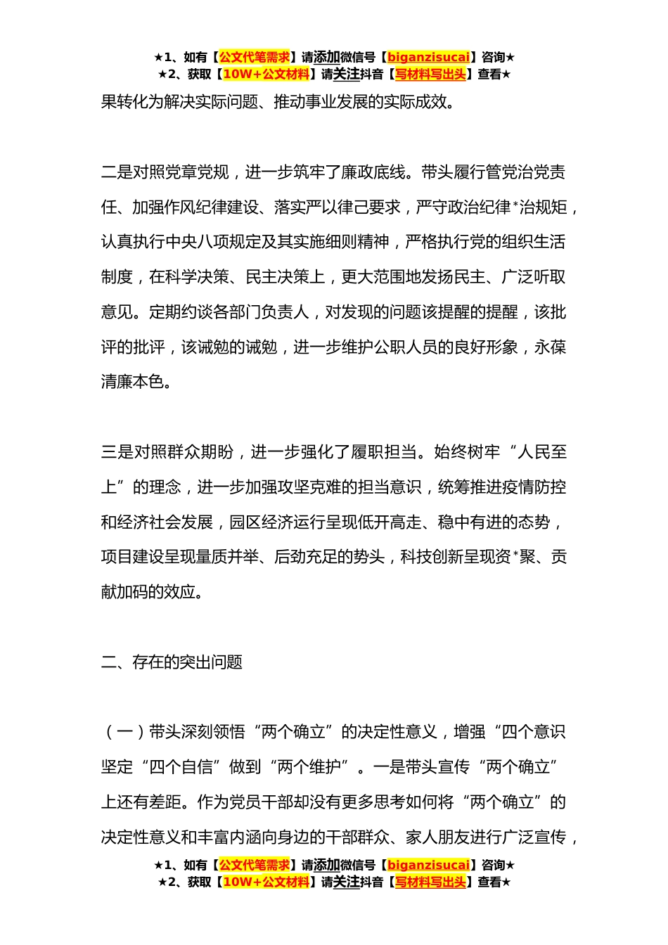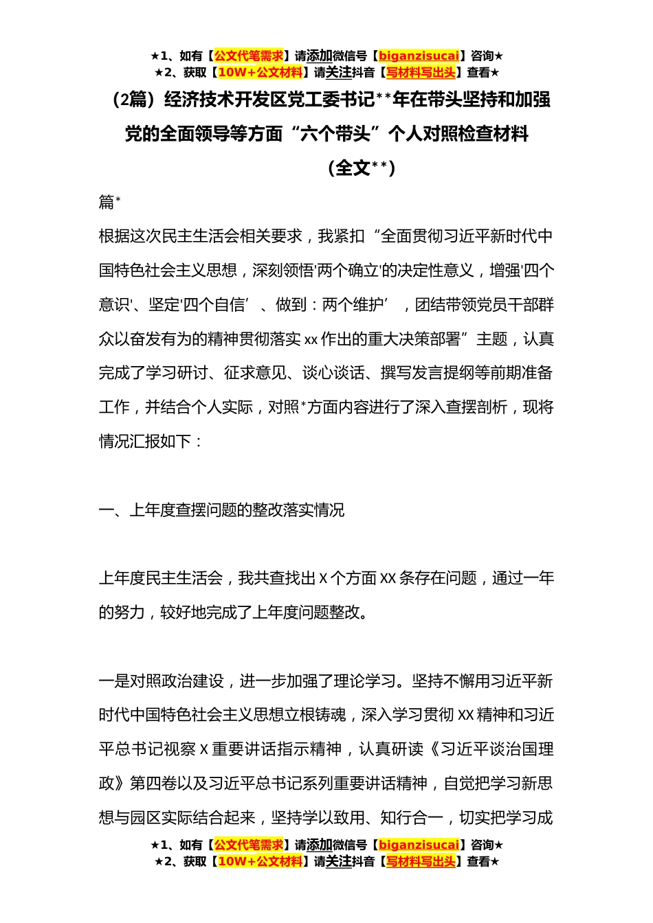 ★1、如有【公文代笔需求】请添加微信号【biganzisucai】咨询★★2、获取【10W+公文材料】请关注抖音【写材料写出头】查看★(2篇)经济技术开发区党工委书记**年在带头坚持和加强党的全面领导等方面“六个带头”个人对照检查材料(全文**)篇*根据这次民主生活会相关要求,我紧扣“全面贯彻习近平新时代中国特色社会主义思想,深刻领悟'两个确立'的决定性意义,增强'四个意识'、坚定'四个自信’、做到:两个维护’,团结带领党员干部群众以奋发有为的精神贯彻落实xx作出的重大决策部署”主题,认真完成了学习研讨、征求意见、谈心谈话、撰写发言提纲等前期准备工作,并结合个人实际,对照*方面内容进行了深入查摆剖析,现将情况汇报如下:一、上年度查摆问题的整改落实情况上年度民主生活会,我共查找出X个方面XX...